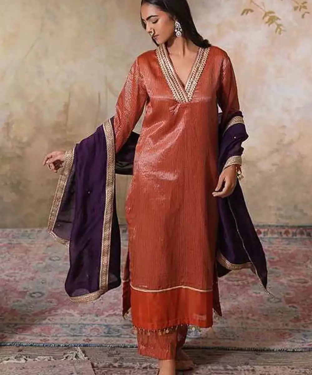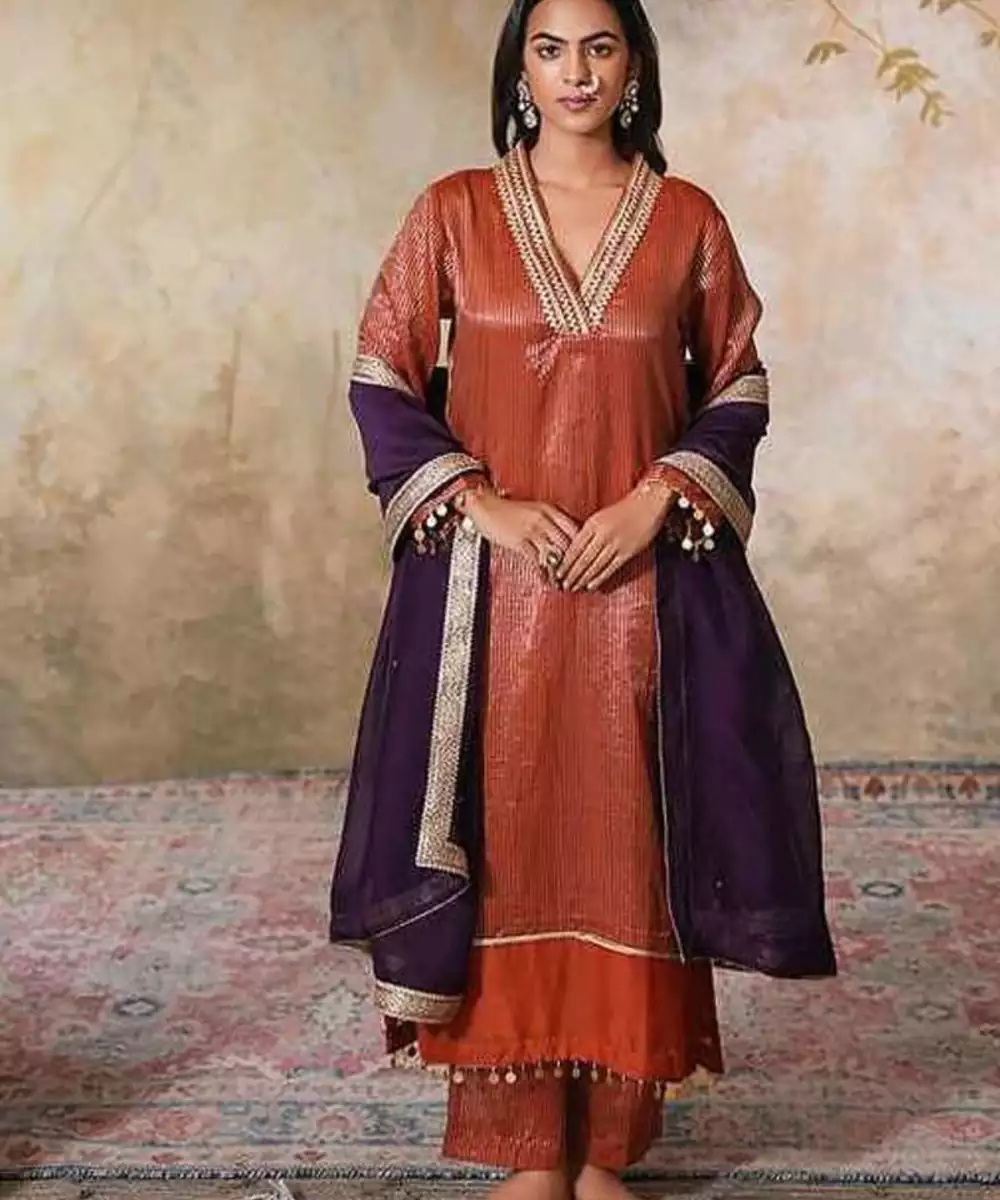 This Rust Gold Striped Chanderi Tissue Zangi Gota Kurta Set Is A Vision Of Grandeur, Perfect For Festive Gatherings Or Special Events. The Kurta Is Adorned With Delicate Organza Detialing On The Hem And Sleeves Along With Gota Embellishments Throughout. The Overlap V Neckline Is Designed With Stunning Gota Embellishments In Gold, While The Sleeves Feature Delicate Gold Coin Hangings On The Cuffs, Complementing The Kurta's Luxurious Feel. The Kurta Is Lined With A Cotton Mul Lining To Add Ease And Comfort.