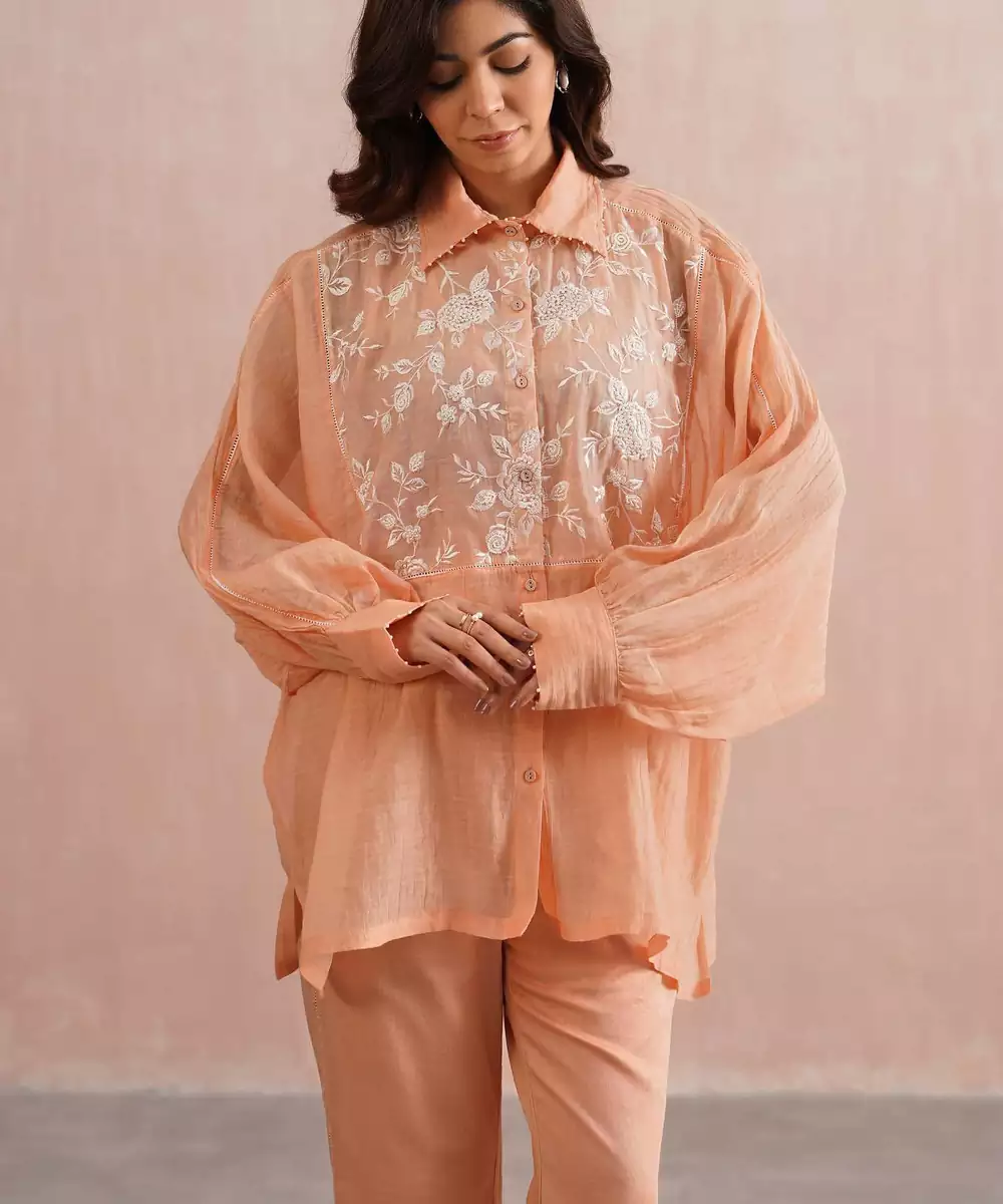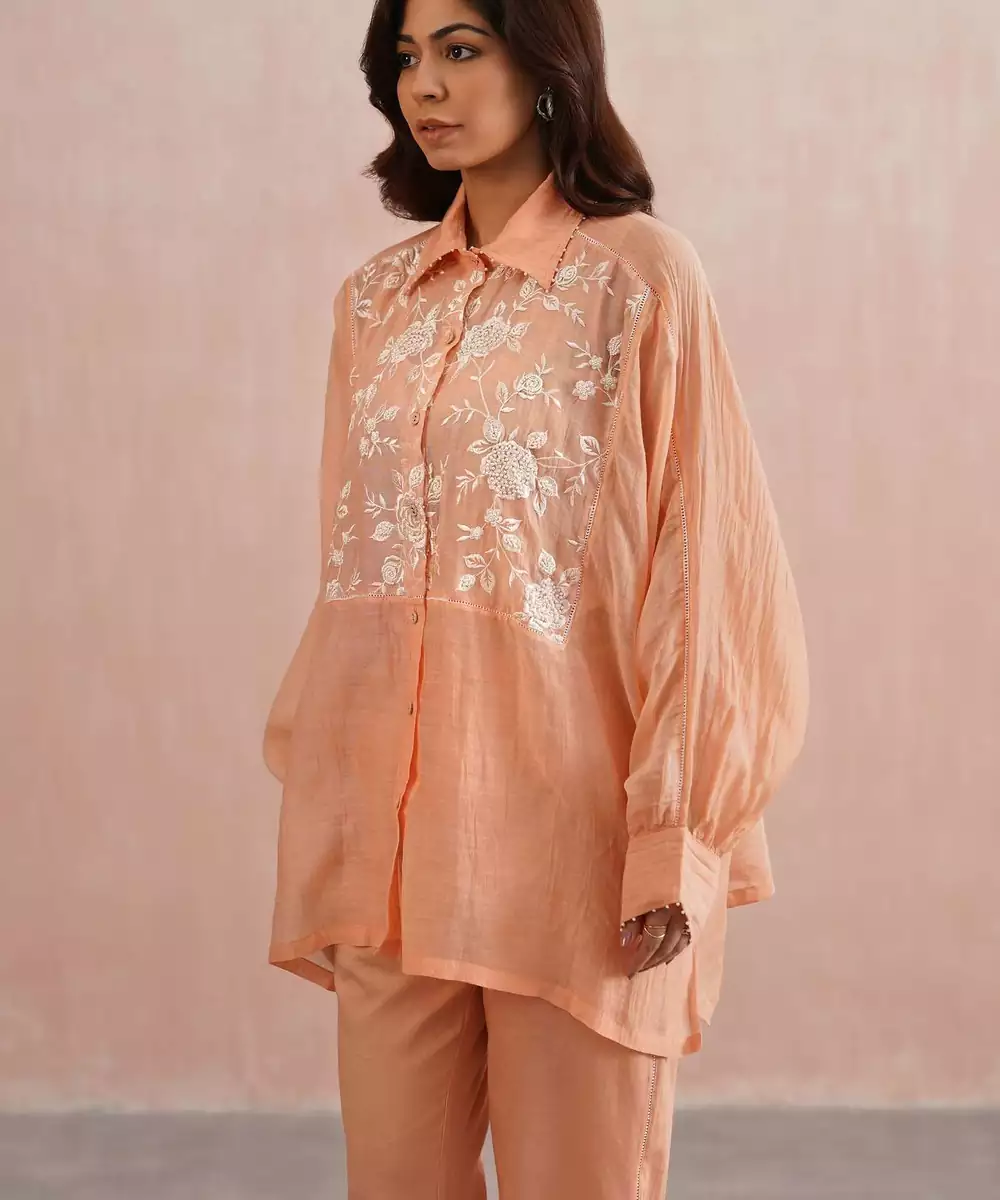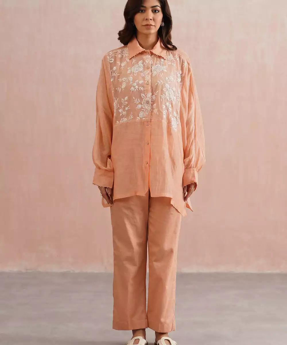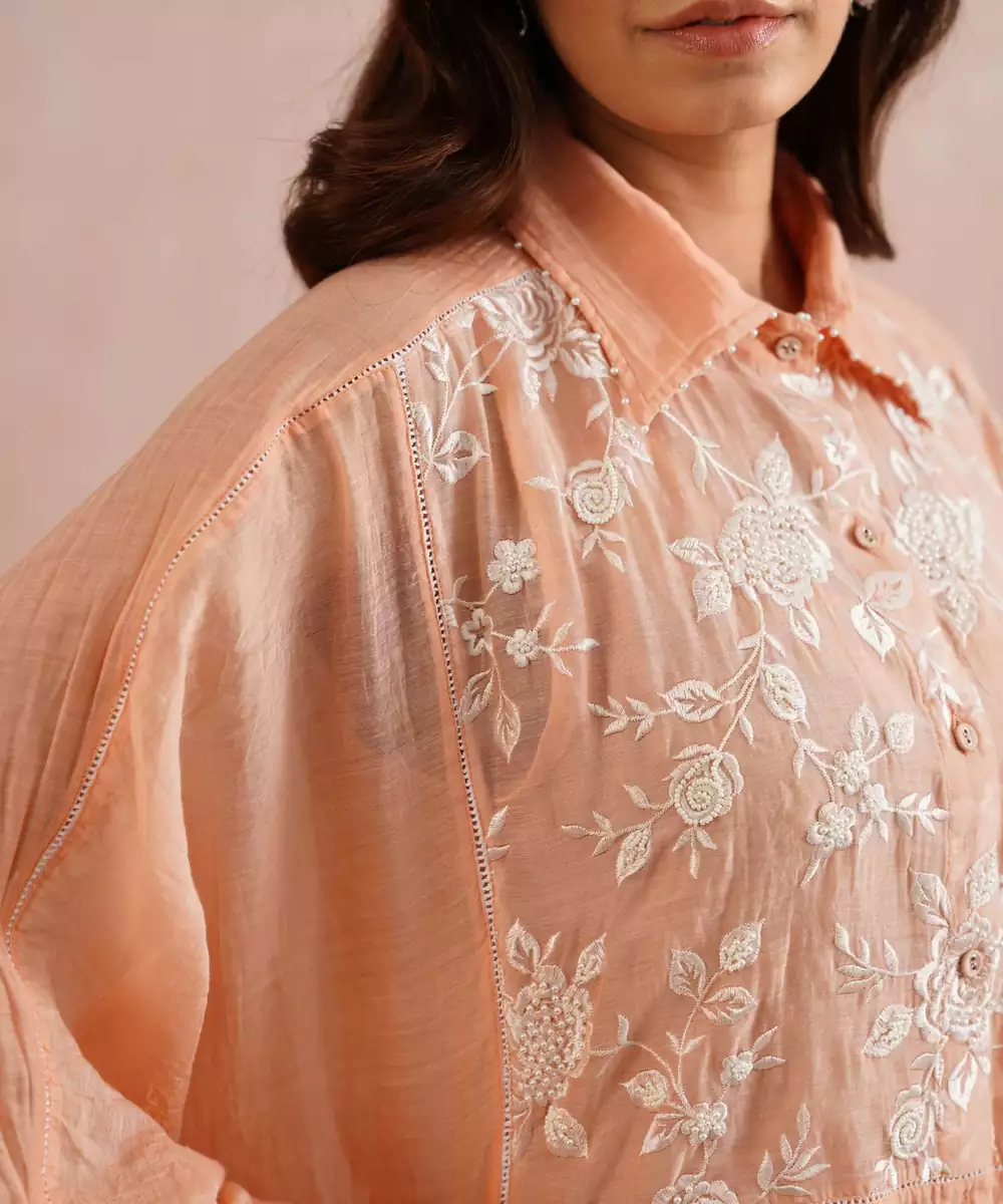 Elegant And Thoughtfully Detailed, The Aurelia Set Comes In A Soft Peach Tone With A Relaxed Kimono Style Shirt. The Front Yoke Is Detailed With Delicate White Lace And Hand Embroidered Roses, Finished With Pearl Embellishments. Pearls Also Accent The Collar And Cuffs, Adding Refined Charm.