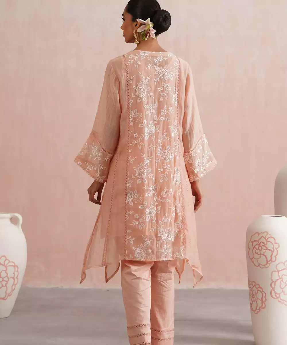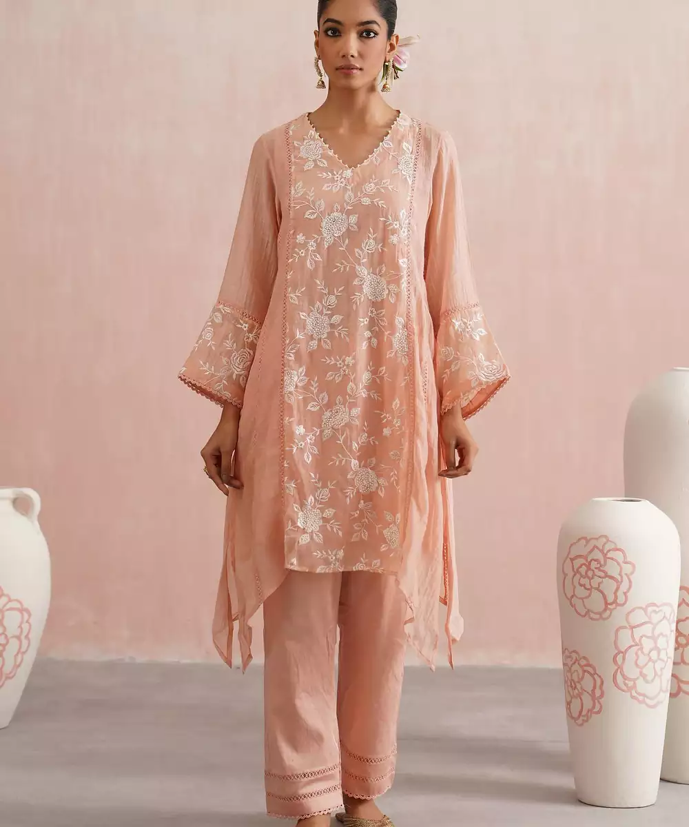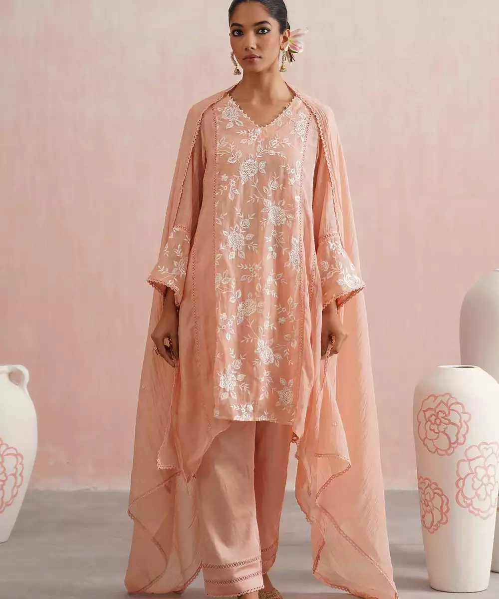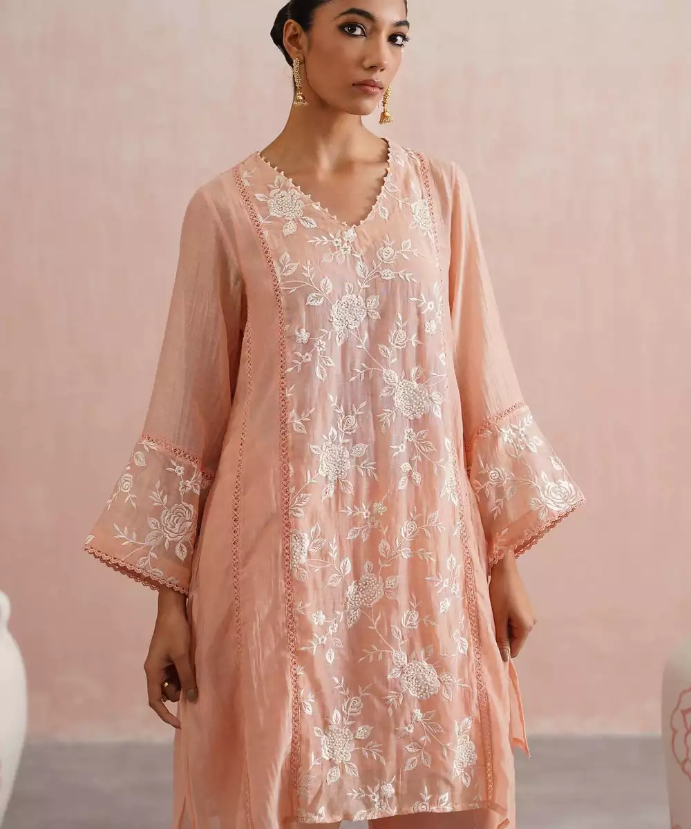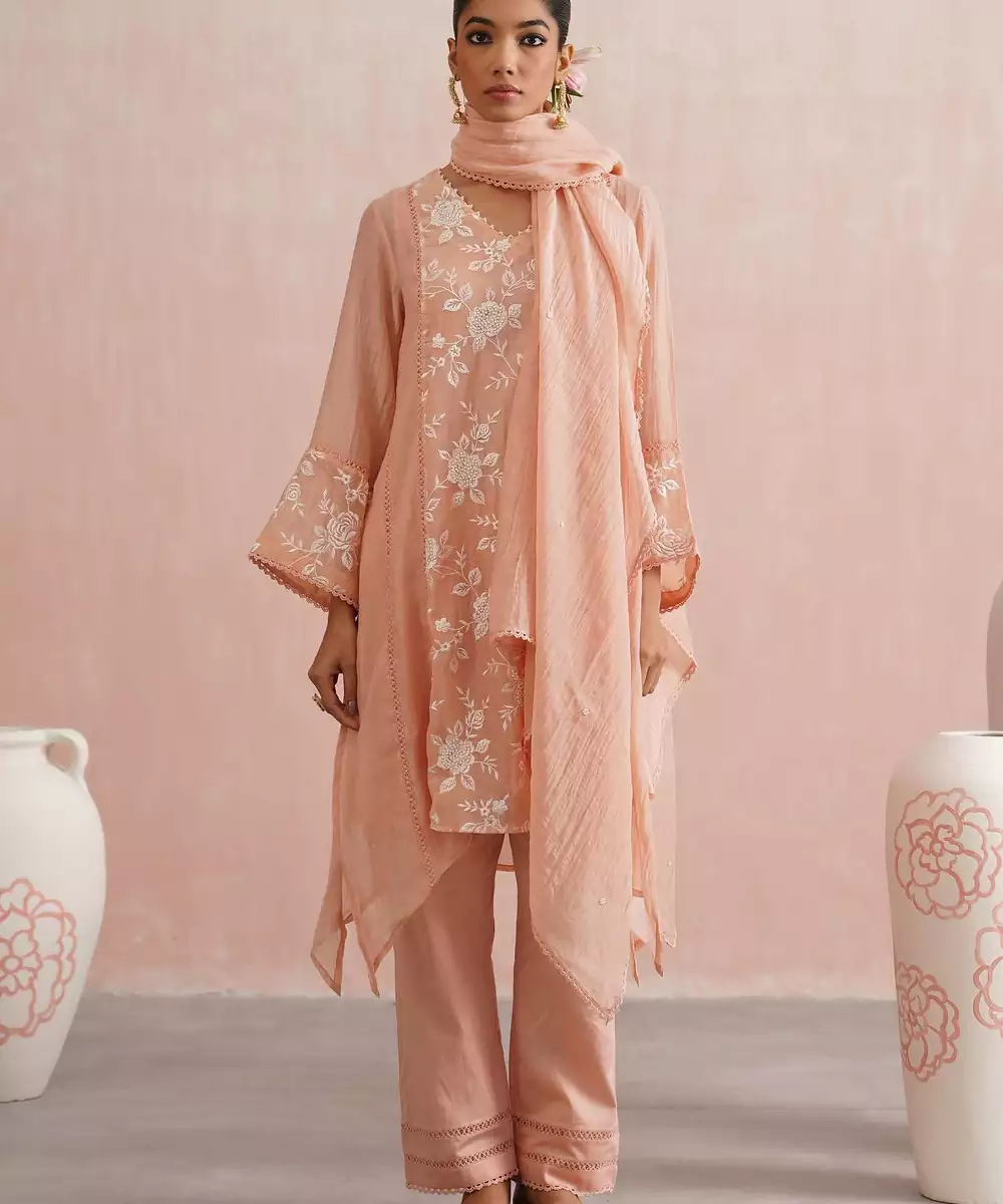 Delicate And Dreamy, The Peony Set Is Perfect For Festive Days, Family Gatherings, And Elegant Occasions.Crafted In Peach Mul Chanderi, The A Line Kurta Features Longer Sides With Soft Slits And Is Beautifully Embroidered With White Roses On The Front, Back Panel, And Sleeves,Enhanced With Pearl Embellishments. A Pearl Detailed V Neckline, Lace Paneling, And Intricate Detailing On The Sleeves And Sides Add Charm To The Silhouette.