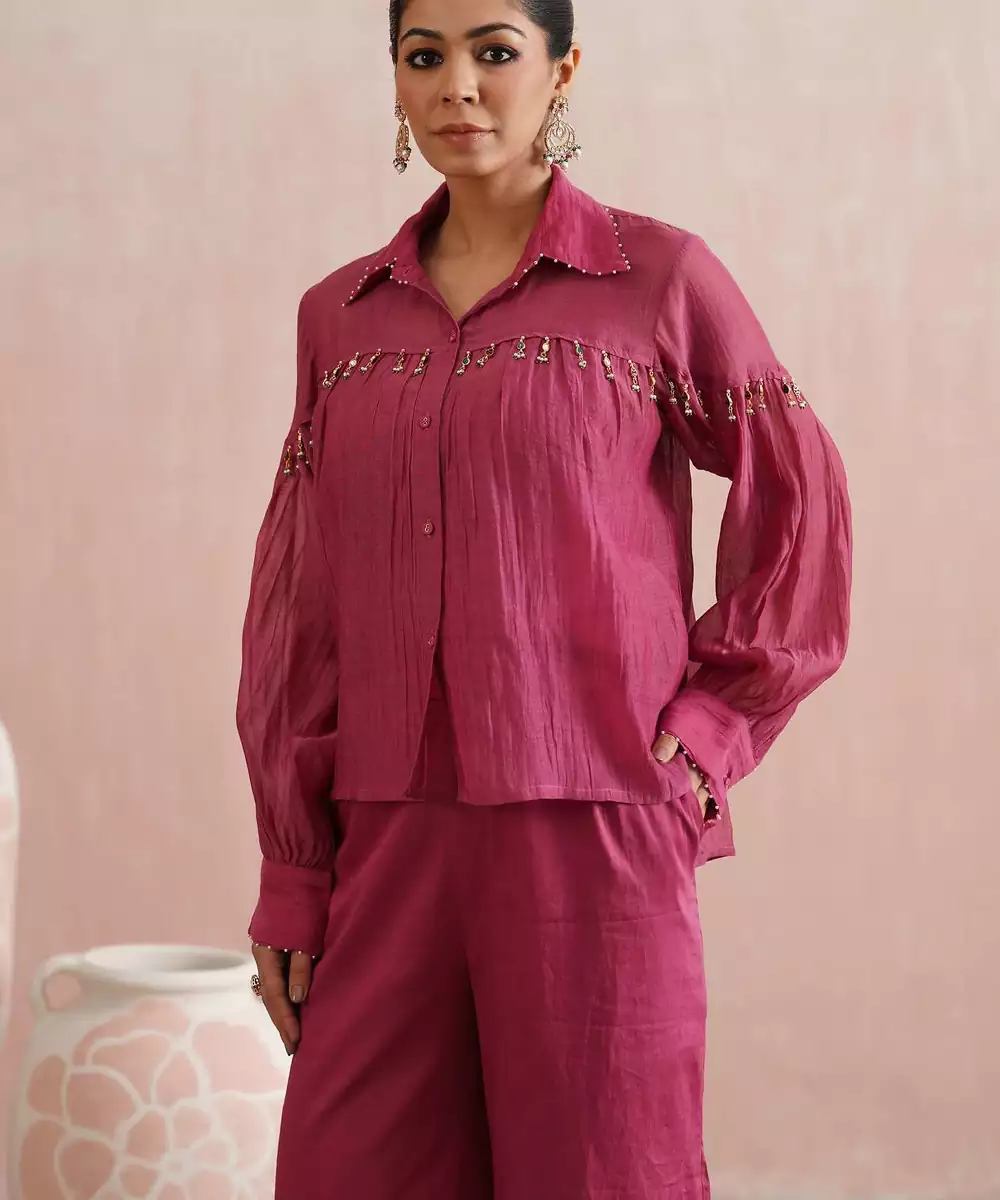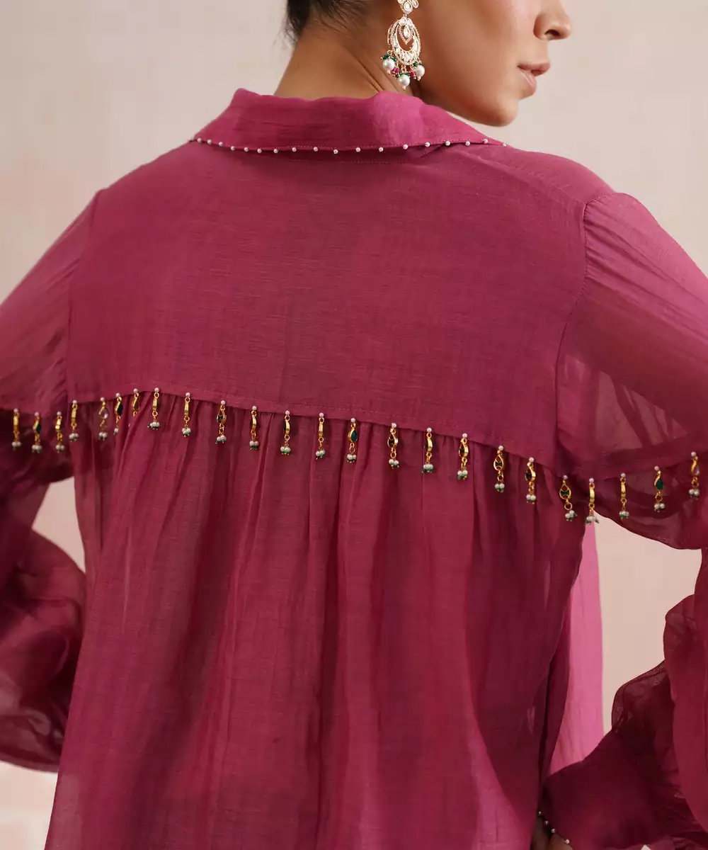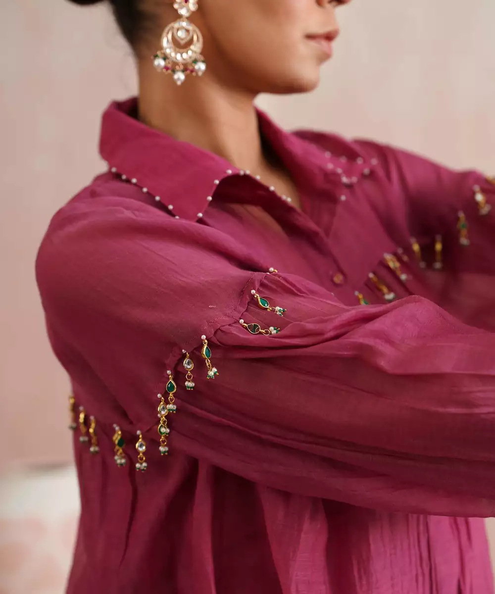 Turn Heads This Festive Season With The Polkira Set, A Stunning Fuchsia Pink Co Ord Set Perfect For Rakhi, Diwali Parties, And Celebratory Gatherings.The Mull Chanderi Shirt Features Delicate Pearl Embroidery Across The Front, Back Yoke, And Shoulders, Elevated With Polki Jewlel Hangings That Add Playful Elegance. Designed With A Collared Neckline, Pearl Detailed Cuffs, And Full Sleeves, This Shirt Brings Festive Glamour With A Soft, Fluid Silhouette.