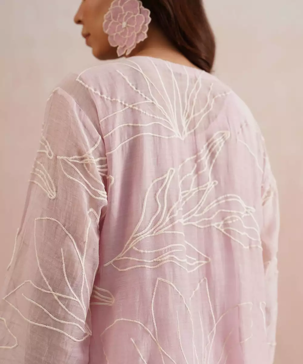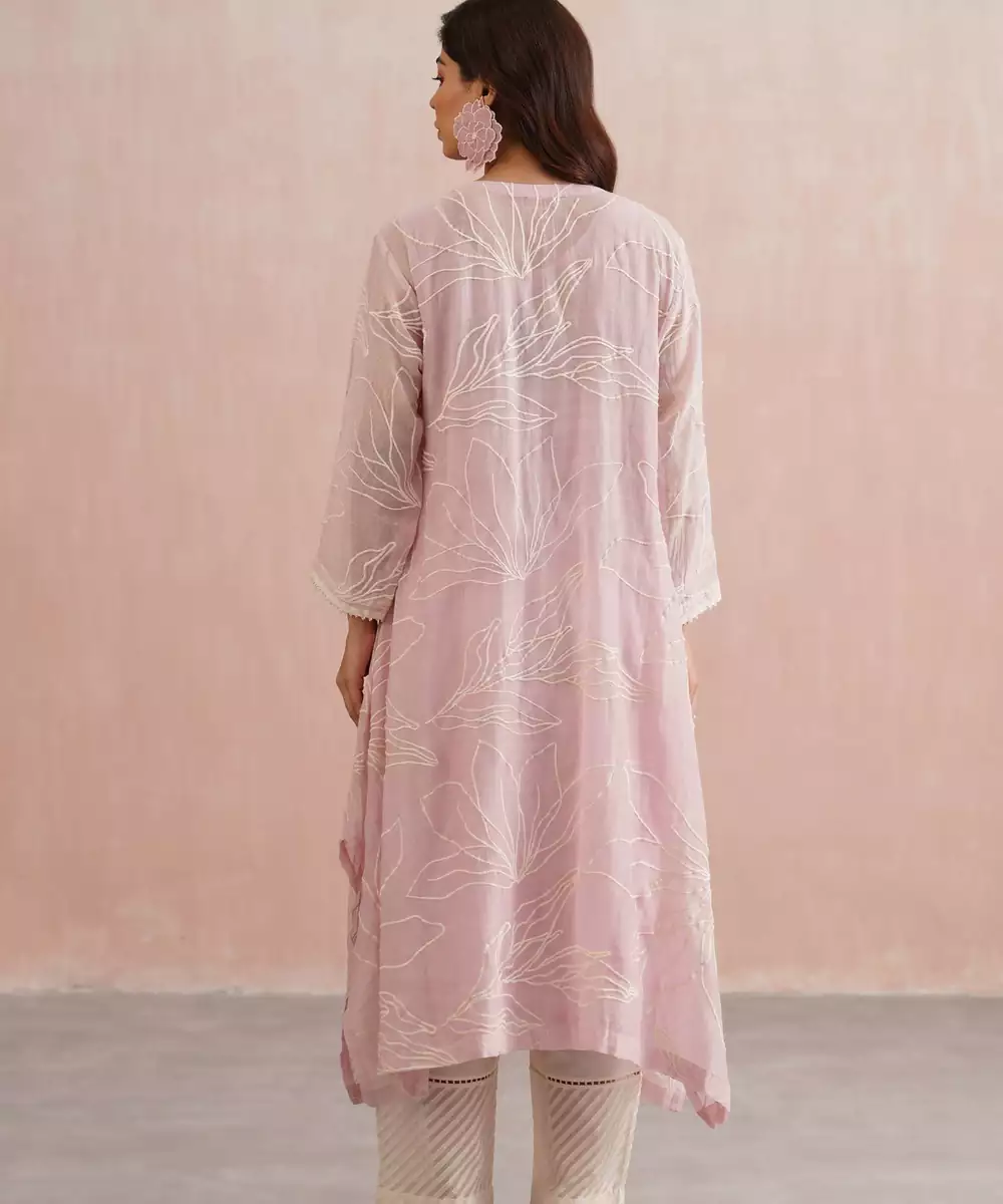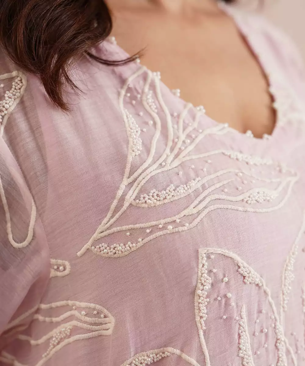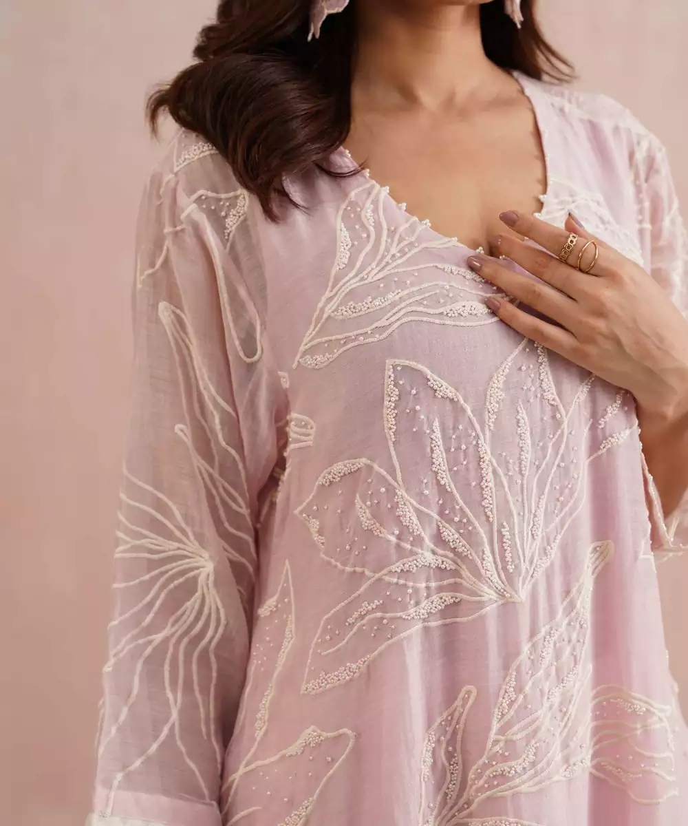 The Liliana Set Is Crafted In A Soft Rose Pink Mul Chanderi And Adorned With Abstract Embroidery Beautifully Handcrafted With Delicate Pearl Embellishments Across The Kurta. An A Line Silhouette Designed With Functional Pockets And A Pearl Detailed V Neckline, It Blends Charm With Comfort.