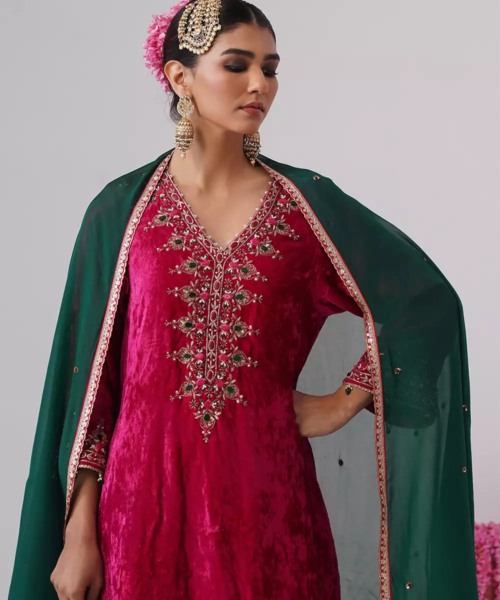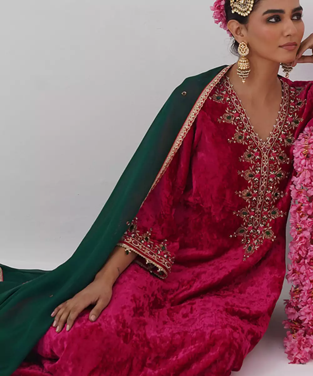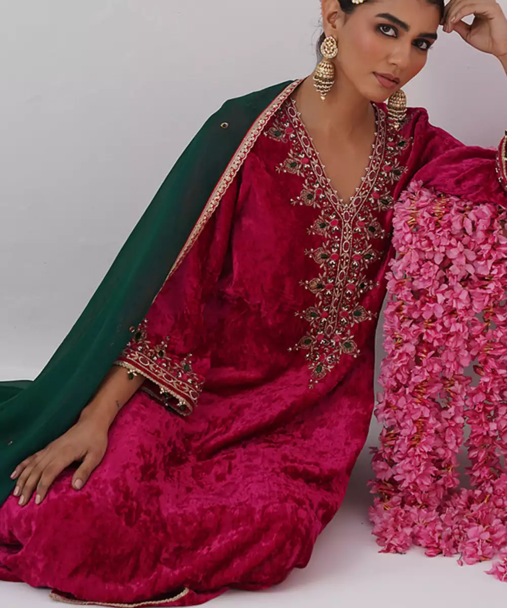 Pink Embroidered Velvet Kurta Set