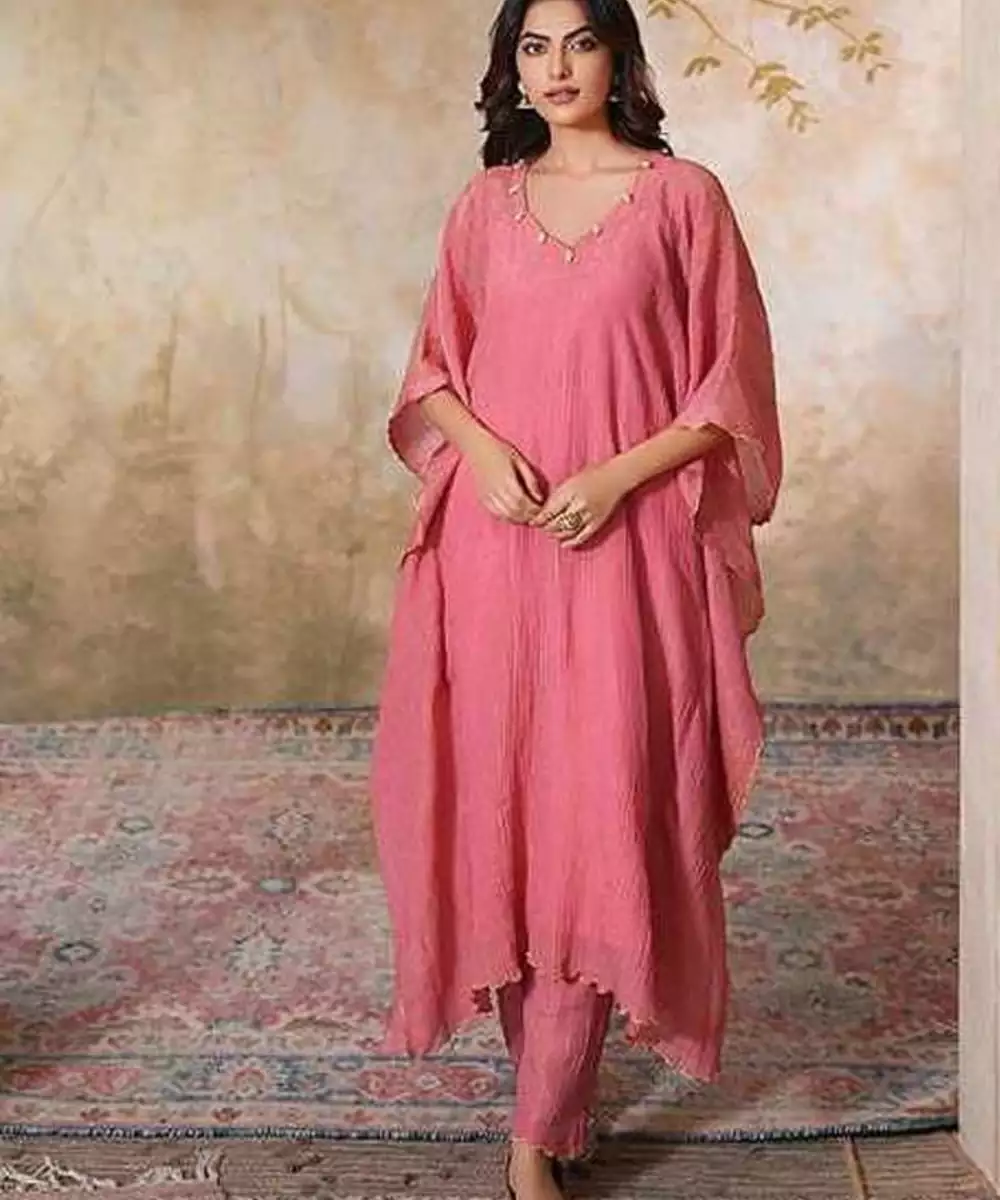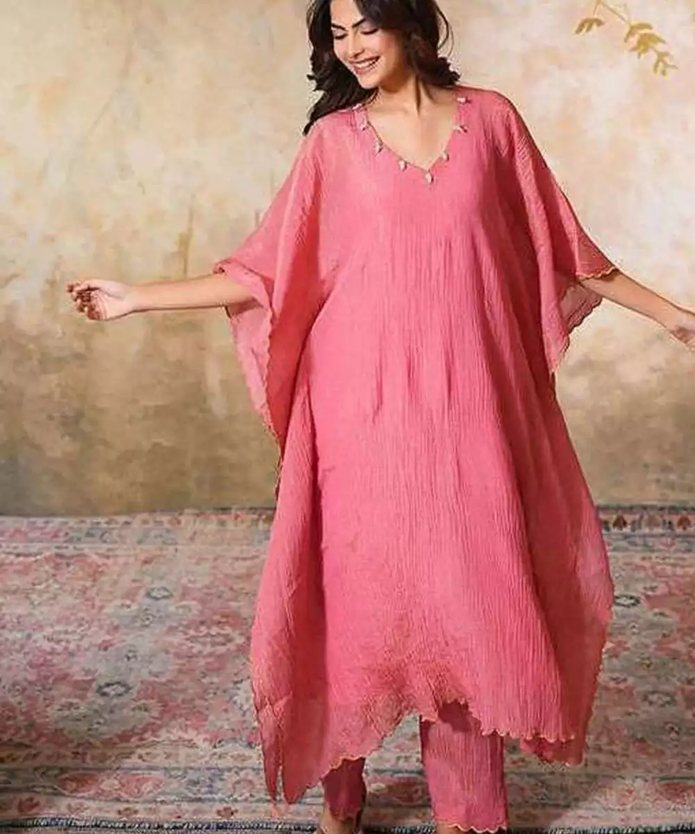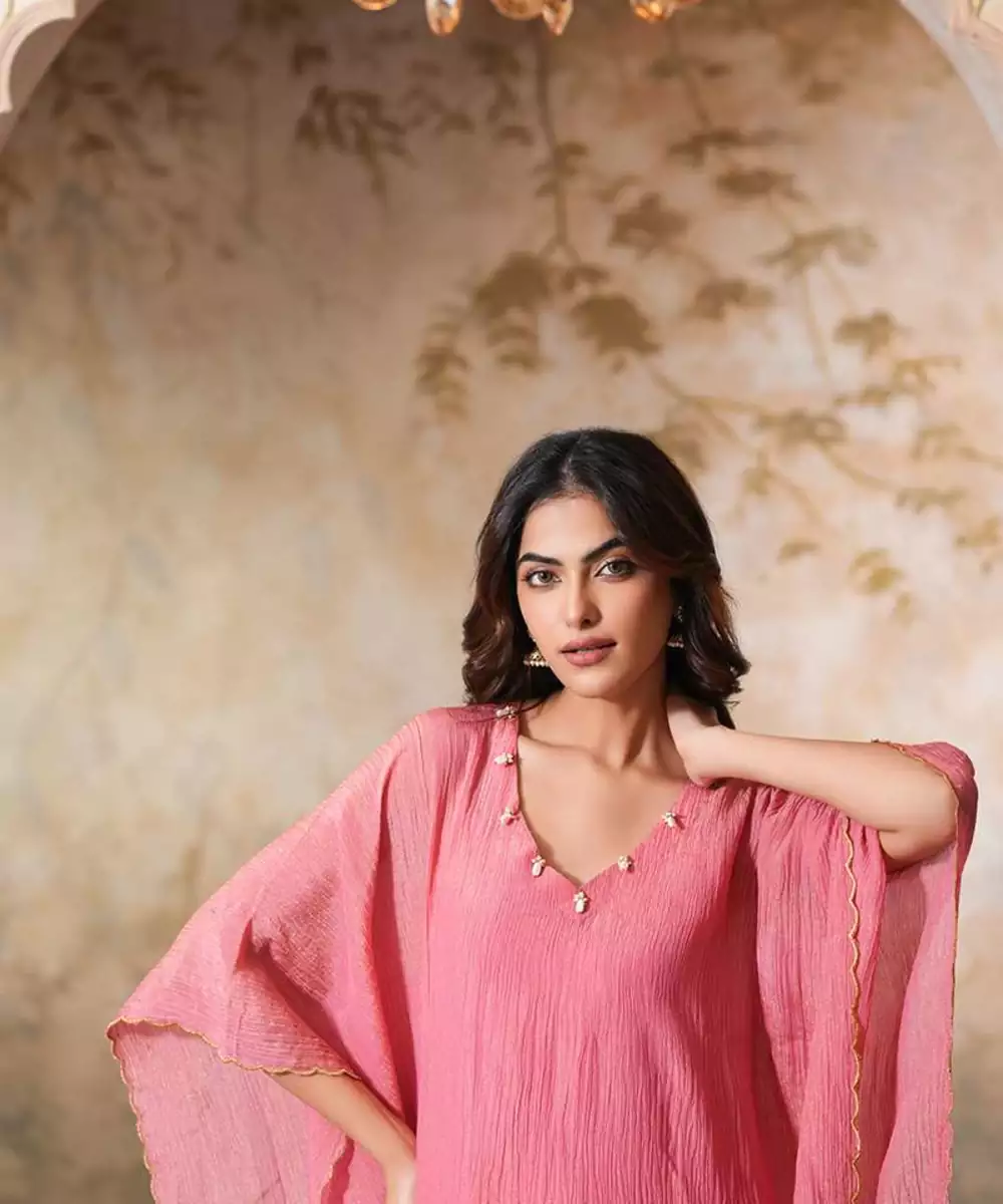 Make A Bold Statement With This Elegant Sharbati Tissue Silk Kaftan Set. The Flowing Kaftan, Crafted From Pink Crushed Tissue Silk, Drapes Effortlessly, Offering Both Comfort And Style For The Upcoming Spring Summer Season. The Standout Feature Of This Kaftan Is The Intricate Gold Scallop Embroidery, Which Complements The Shimmer Of The Tissue Silk Fabric.