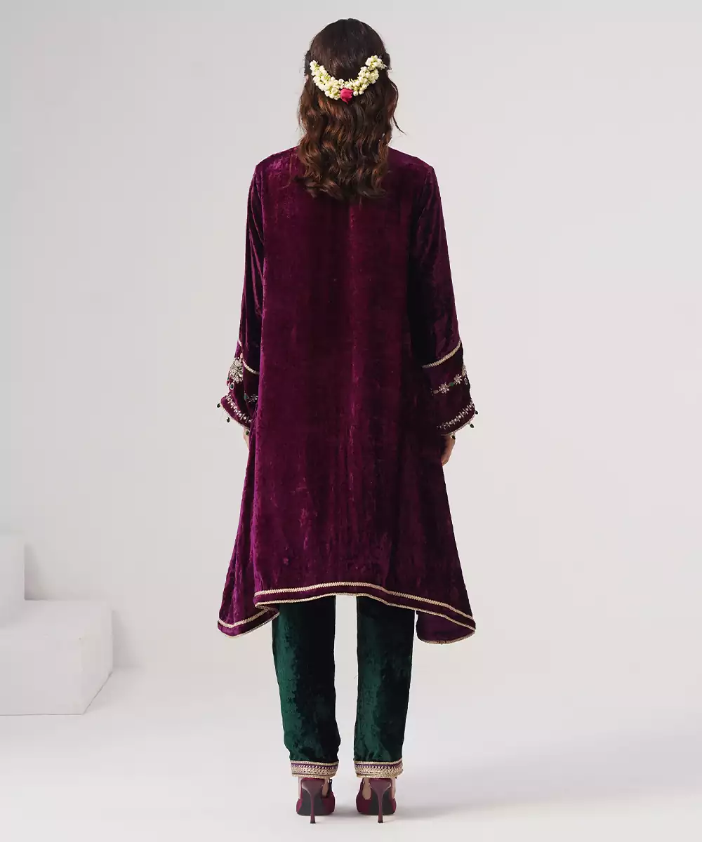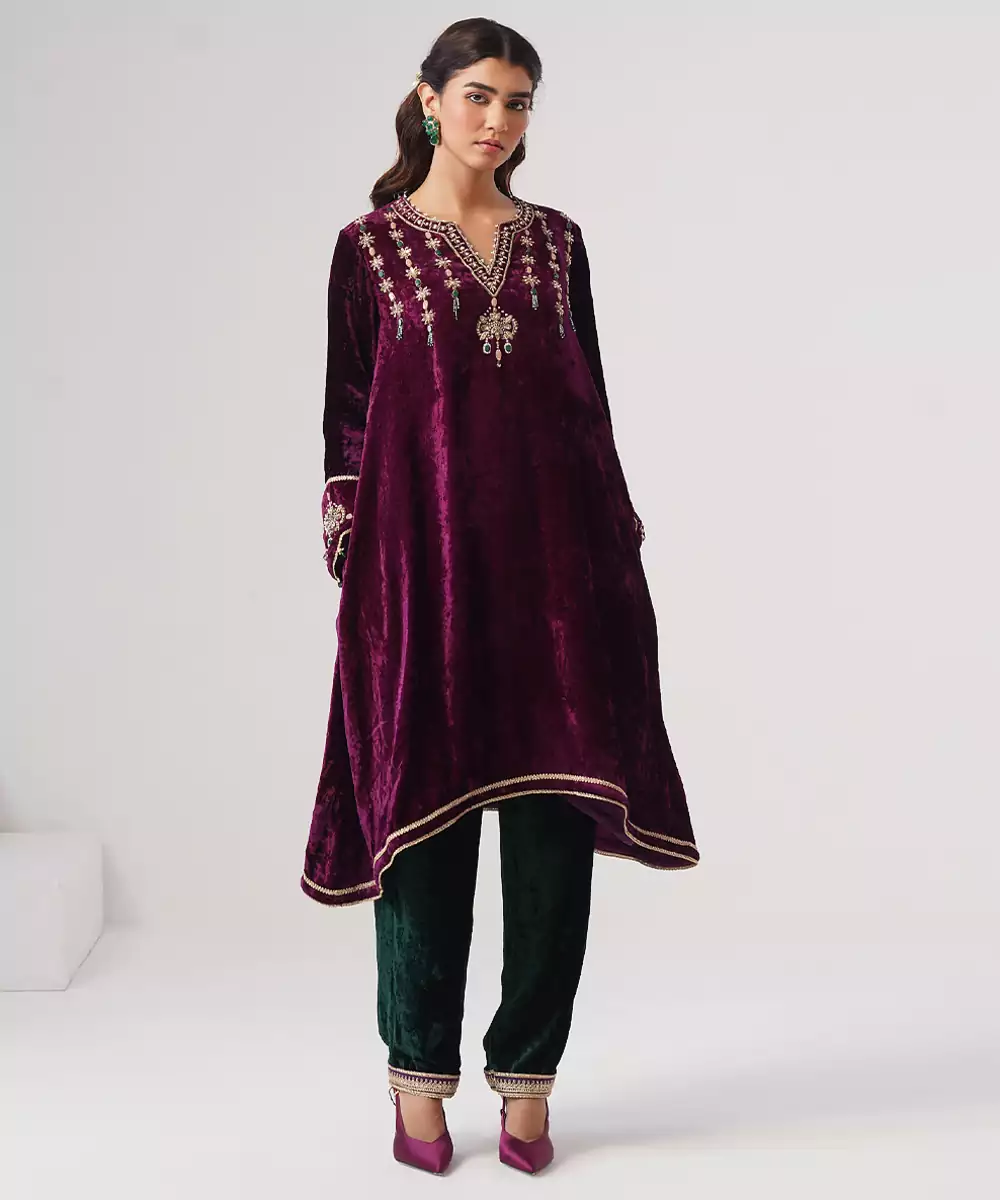This Purple Embroidered Velvet Kaftan Exudes Luxurious Elegance And Timeless Sophistication. Crafted From Rich, Soft Velvet, It Features Intricate Embroidery That Adds A Regal, Refined Touch. Perfect For Evening Gatherings And Festive Occasions, It Offers A Graceful Flow, Comfortable Fit, And Effortlessly Glamorous Appeal.
