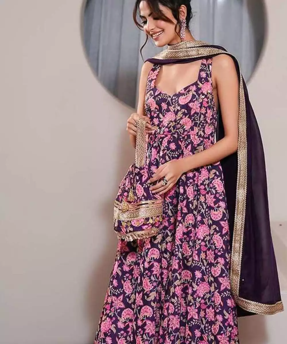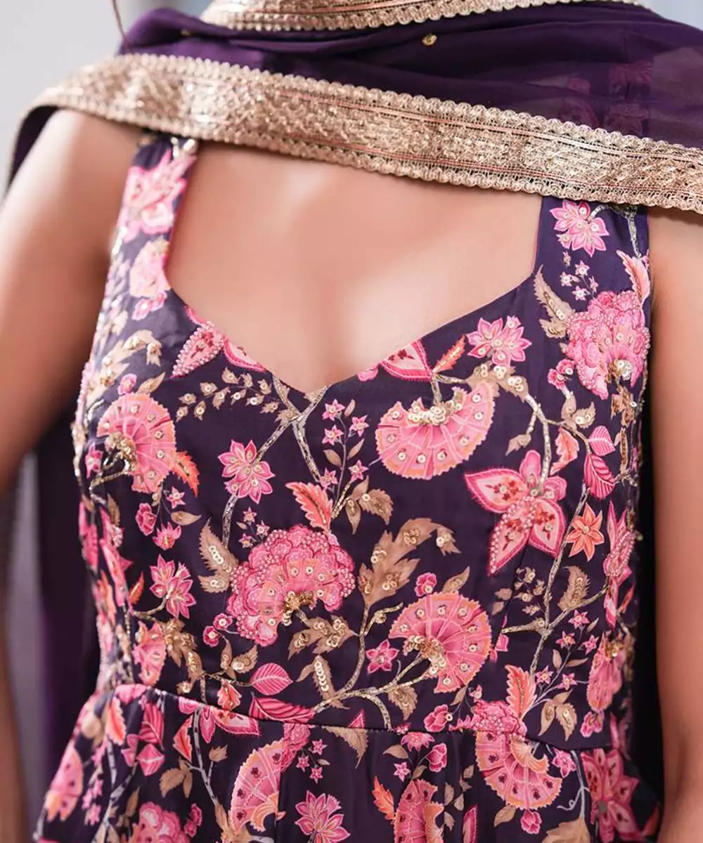 Step Into Timeless Grace With This Violet Chintz Printed Crepe Silk Zinnia Gul Anarkali Set, Perfect For Making An Elegant Statement. The Halter Neck Kurta With A Back Opening Features Delicate Floral Embroidery That Spreads Across The Bodice And Flares Gracefully, Accentuating Its Flowing Silhouette. The Hem Is Adorned With Gota Embelishments, Adding A Hint Of Sophistication.