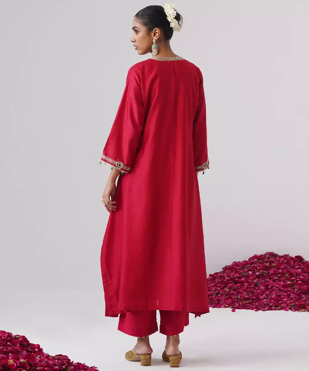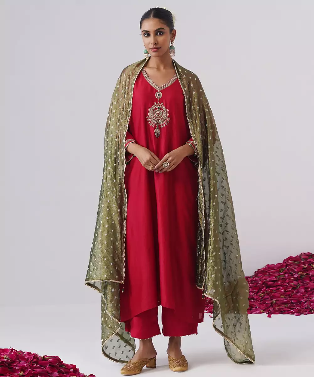 This Red Embroidered Chanderi Silk Kurta Set Radiates Festive Elegance And Graceful Charm. Crafted From Lightweight, Lustrous Chanderi Silk, It Features Intricate Embroidery That Adds A Refined, Traditional Touch. Perfect For Celebrations And Special Occasions, It Offers Comfort, A Flattering Silhouette, And Timeless Ethnic Appeal.