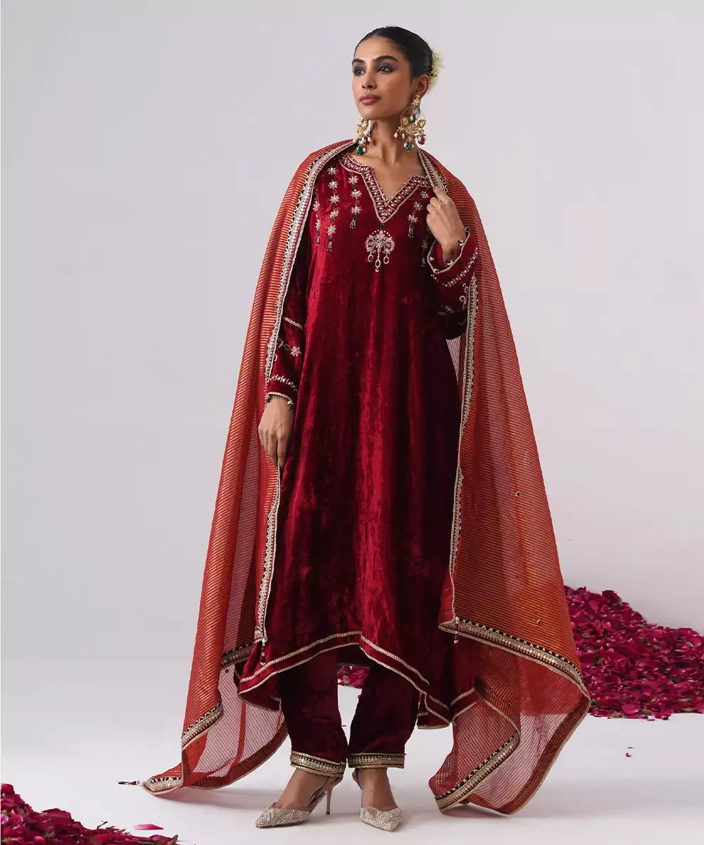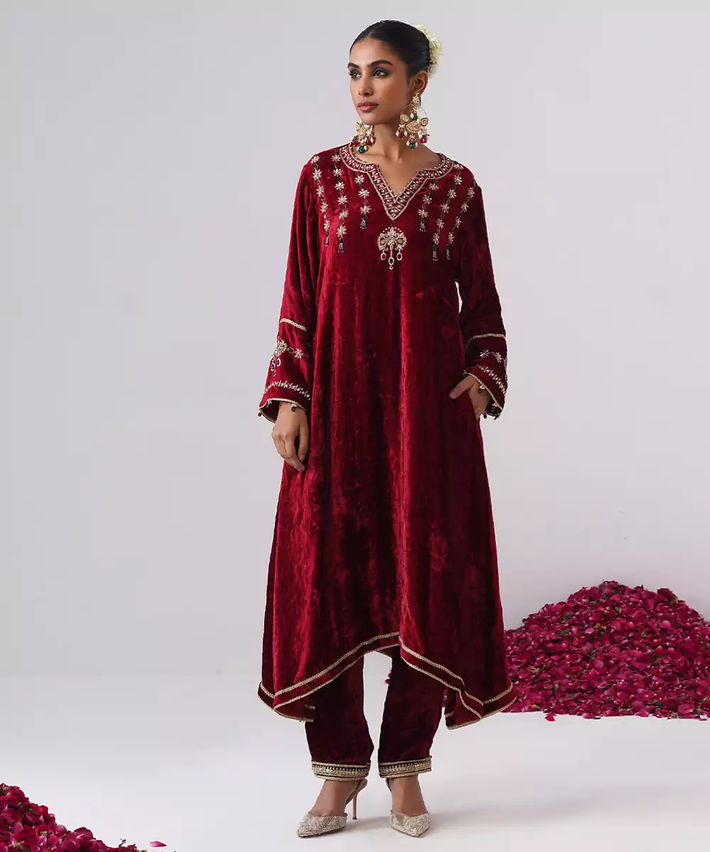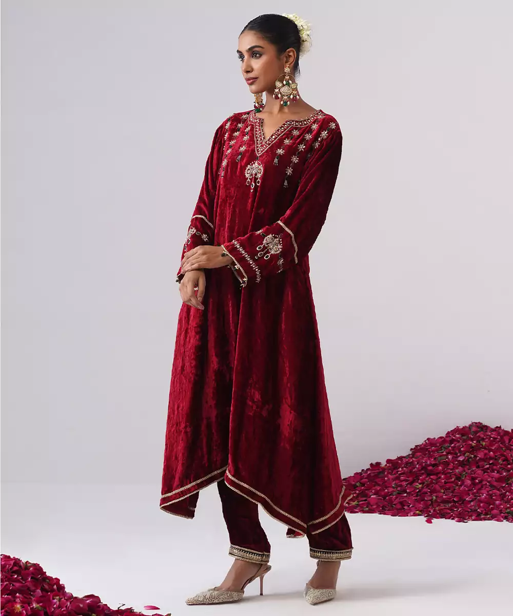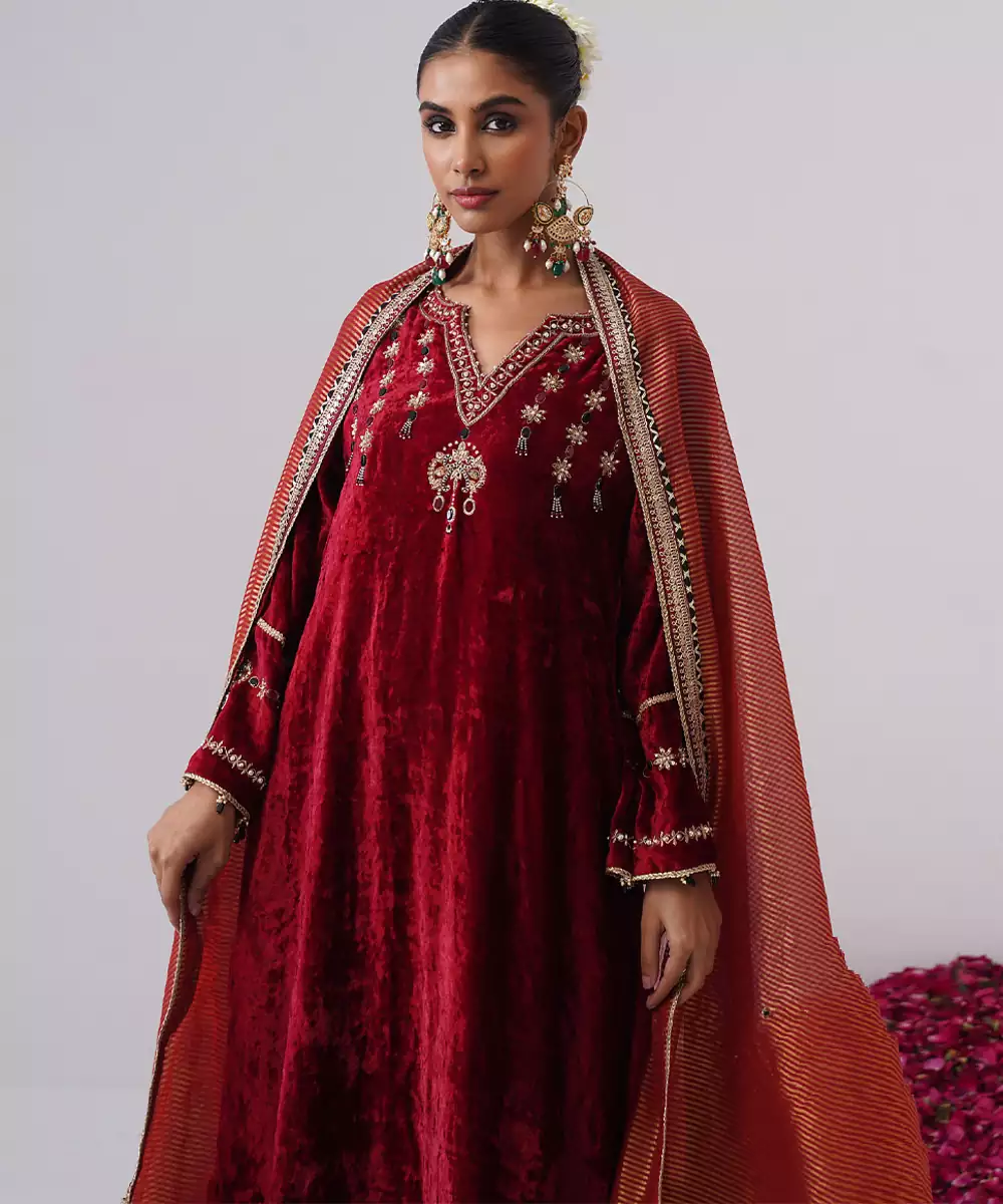 This Red Embroidered Velvet Kaftan Exudes Luxurious Elegance And Timeless Sophistication. Crafted From Rich, Soft Velvet, It Features Intricate Embroidery That Adds A Regal, Refined Touch. Perfect For Evening Gatherings And Festive Occasions, It Offers A Graceful Flow, Comfortable Fit, And Effortlessly Glamorous Appeal.