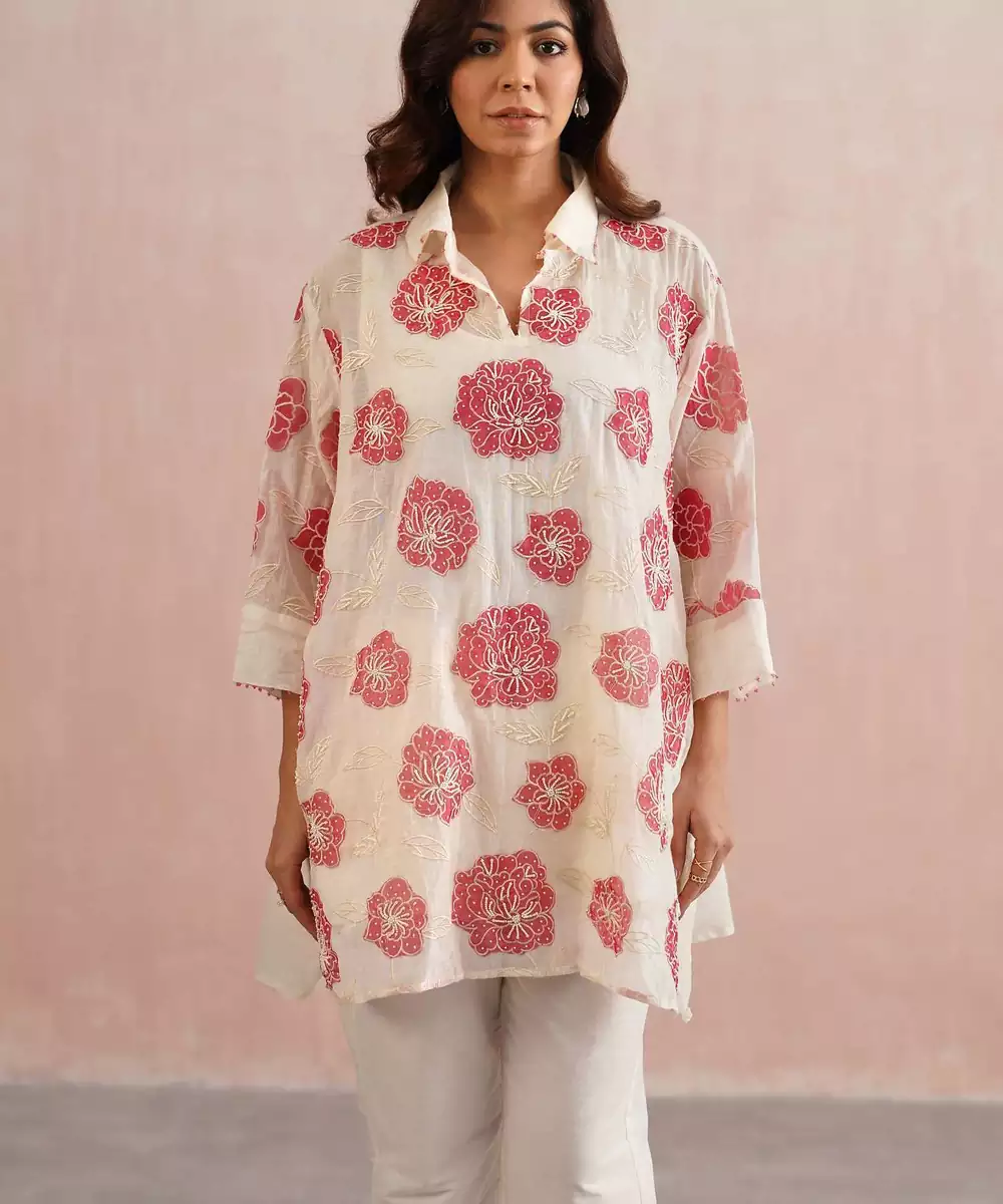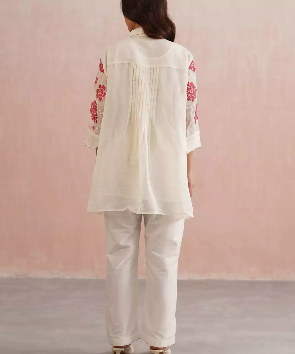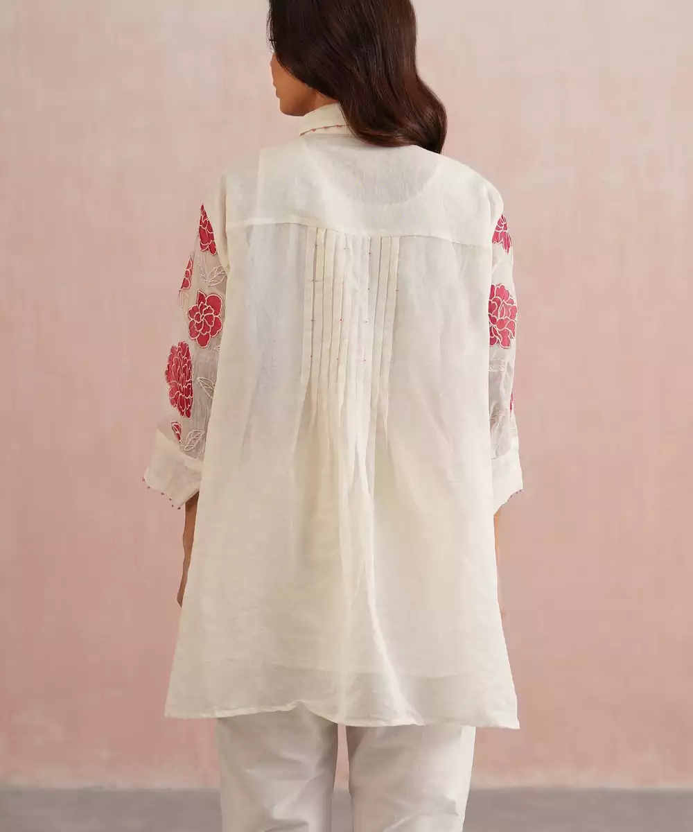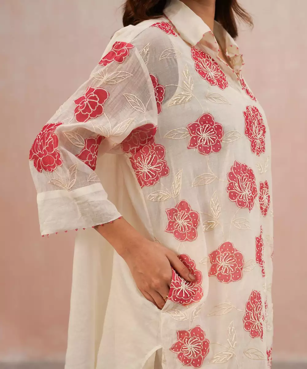 A Vibrant Blend Of Comfort And Craft, The Scarlet Set Features A Free Size, Oversized Shirt In Ivory Mul Chanderi, Adorned With Striking Red Floral Appliqué Embroidery. Each Bloom Is Meticulously Handcrafted With Delicate Pearl Detailing, While Red Bead Accents Along The Collar And Sleeve Cuffs Echo The Floral Hue.