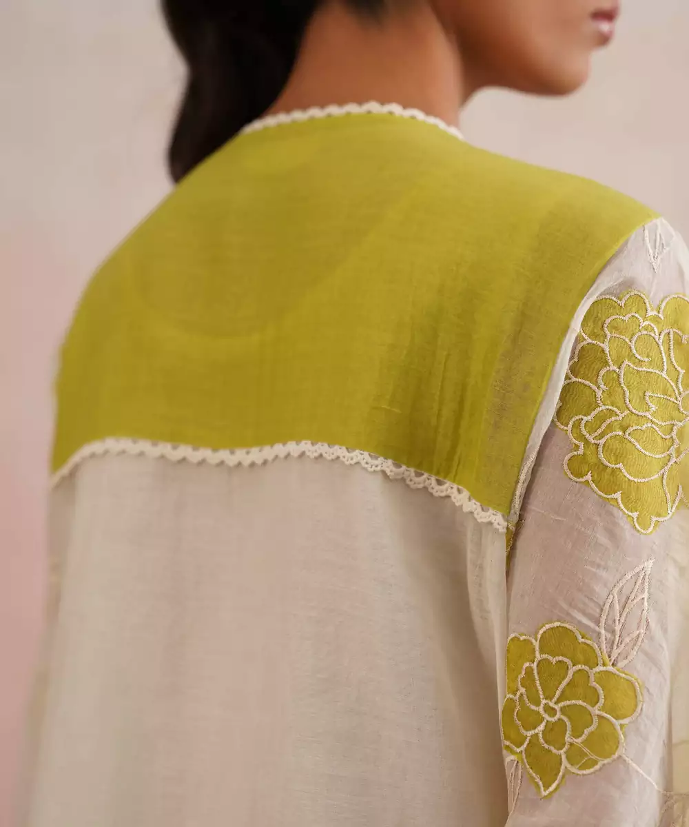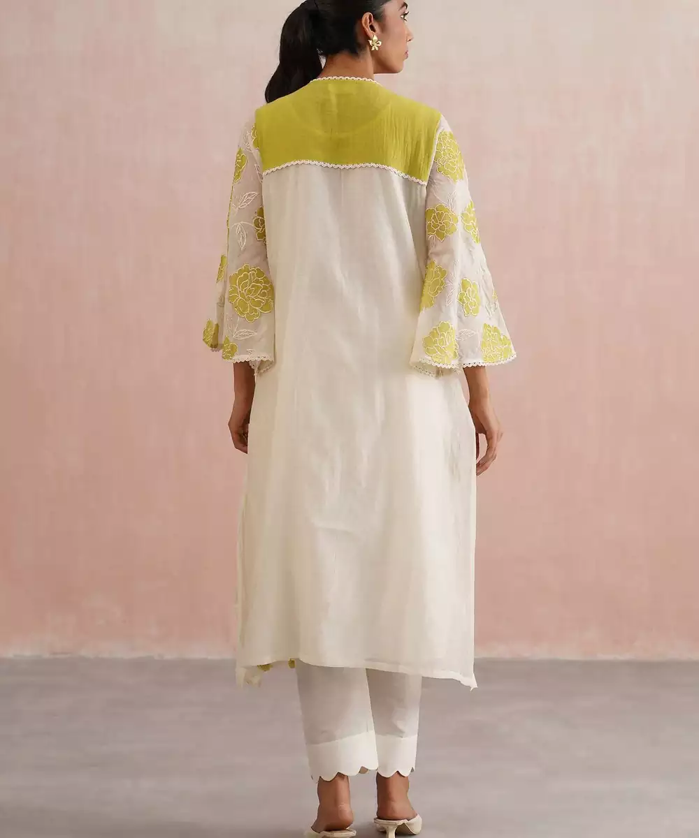 The Zinnia Set Is A Soft, Graceful Choice For Festive Occasions Like Rakhi, Diwali Brunches, Or Intimate Gatherings.Made In Pure Mul Chanderi Fabric, The Kurta Features Lime Green Floral Appliqué Embroidery With Pearl Embellishments And A Delicate Lace Trimmed V Neckline. The Full Length Umbrella Sleeves And A Matching Blue Back Yoke With Lace Adds Elegance And Ease. It Has A Straight Fit With Slits.