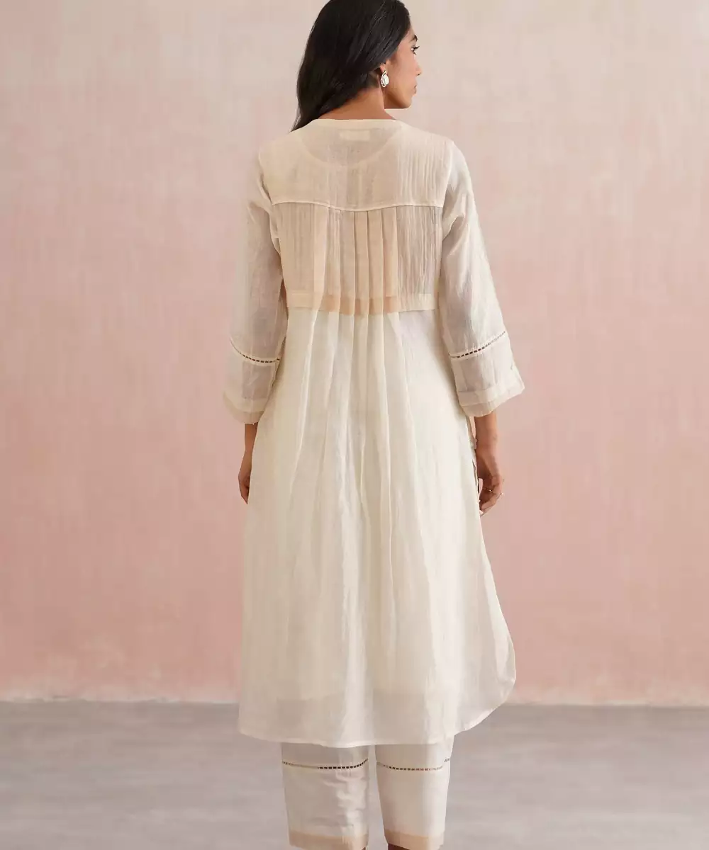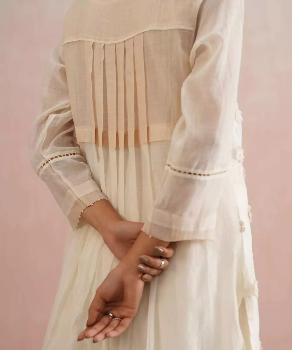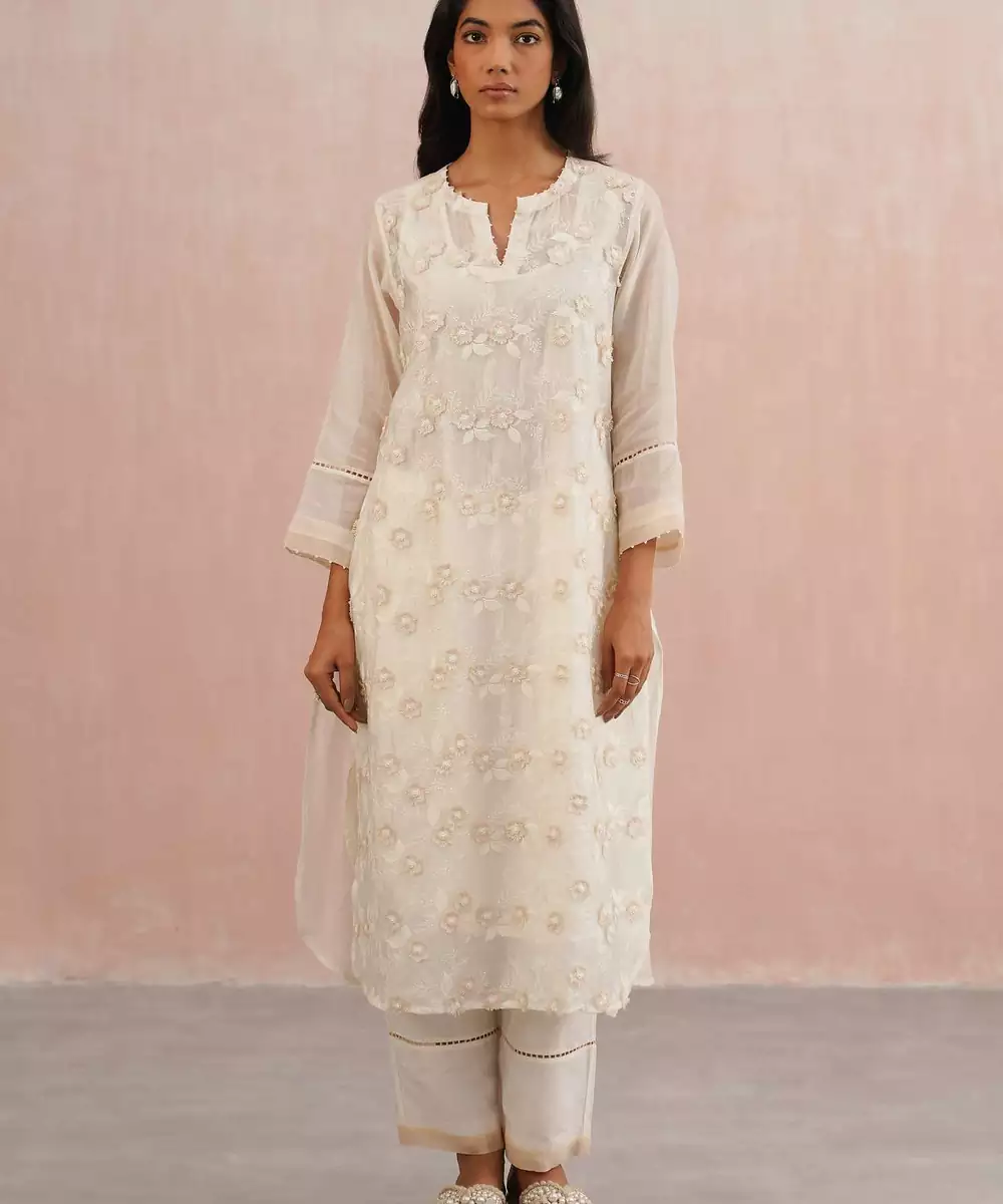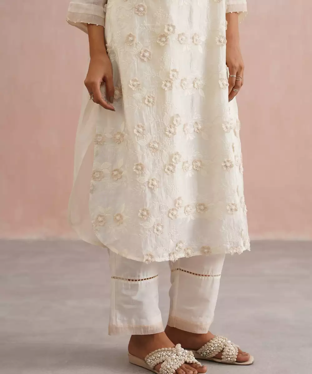Ethereal, Refined, And Refreshingly Elegant The Serena Set Is Crafted In Serene Ivory Mul Chanderi, Featuring Delicate 3 D Mint Beige Floral Embroidery With Intricate Pearl Accents On Each Bloom. The Full Length Sleeves Are Finished With Lace Inserts And Beige Green Borders, Mirroring The Embroidery’s Subtle Charm.