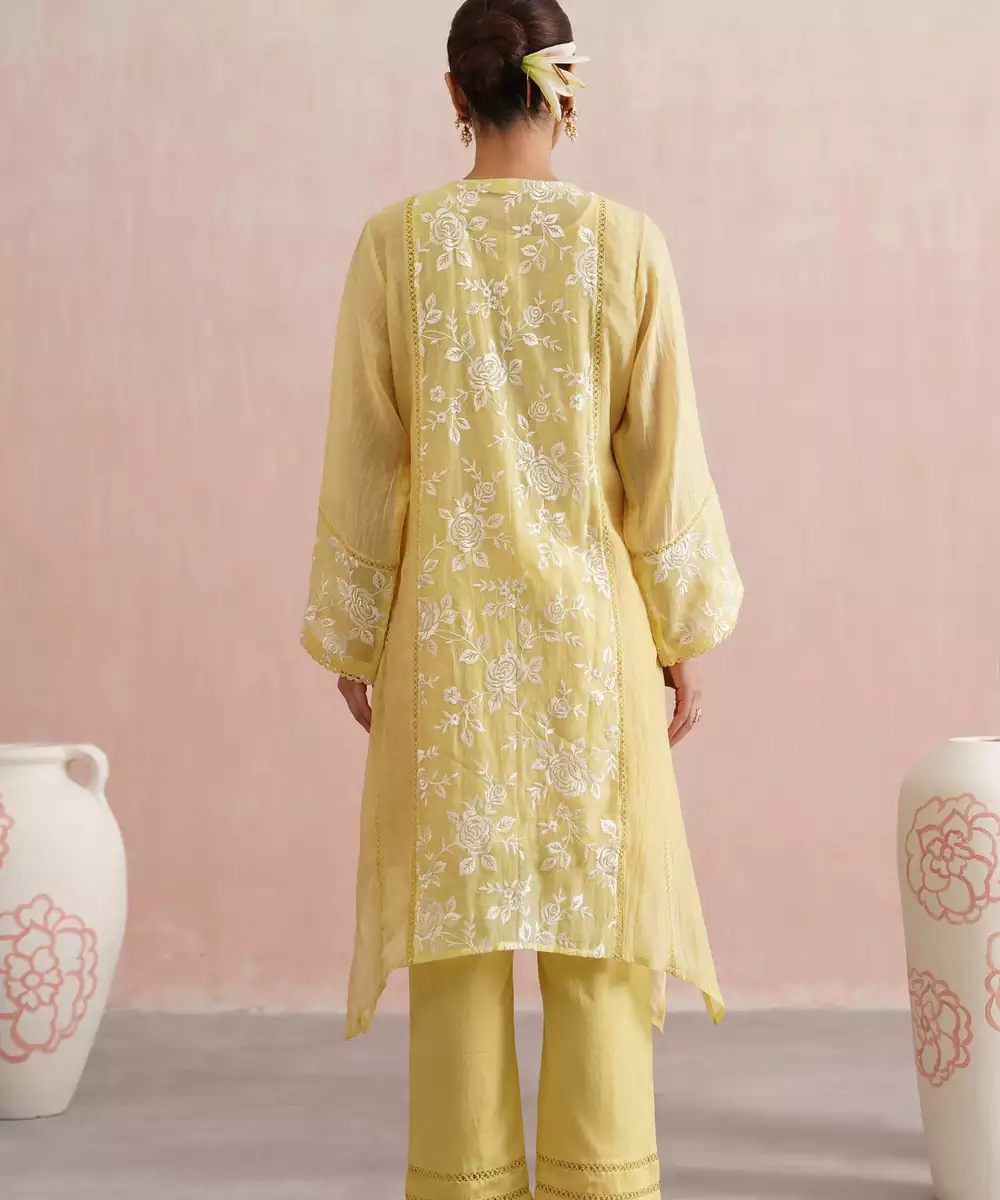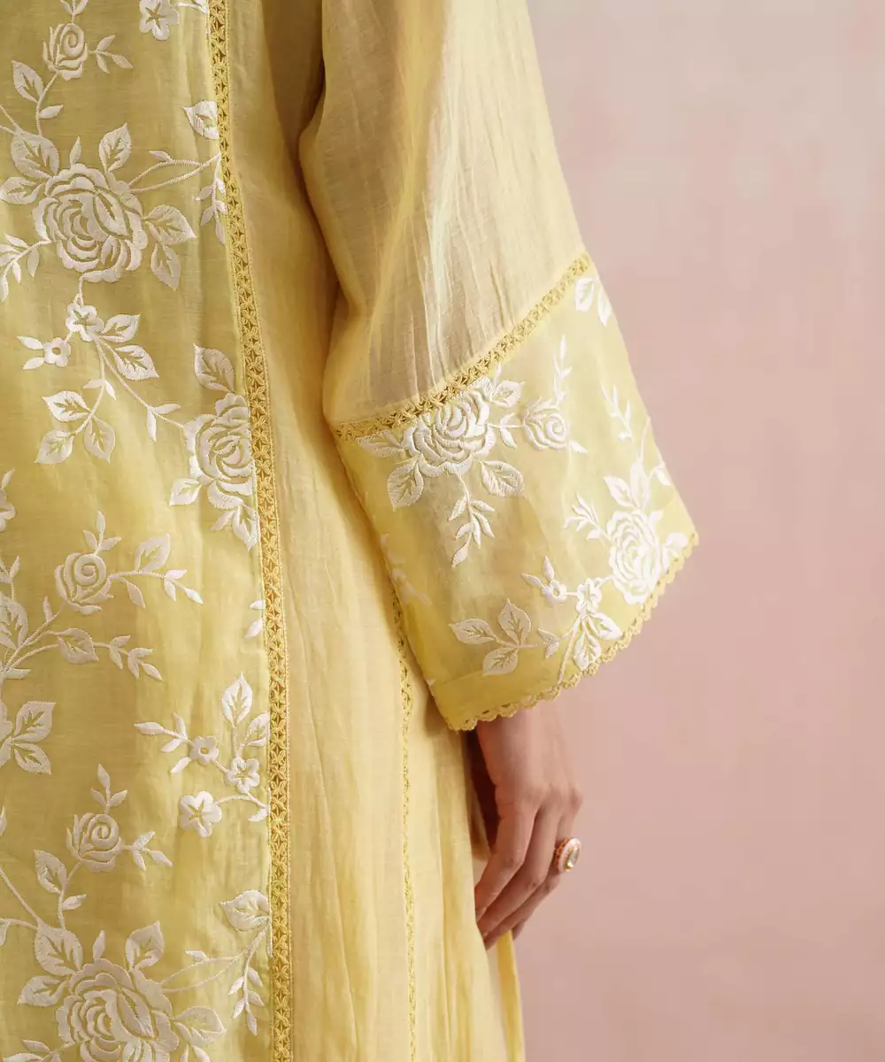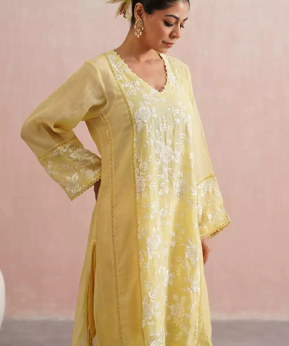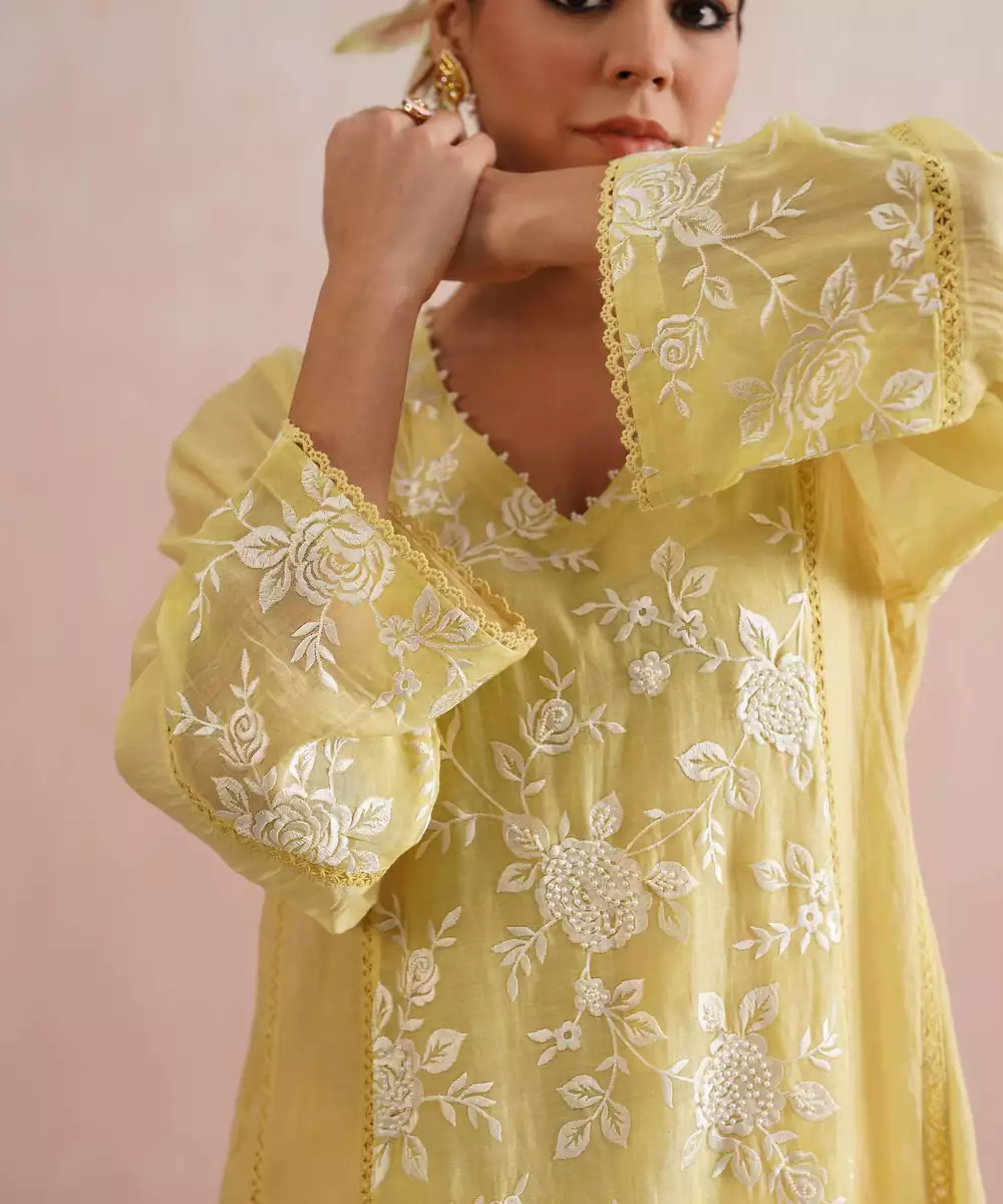 Delicate And Dreamy, The Dahlia Set Is Perfect For Festive Days, Family Gatherings, And Elegant Occasions.Crafted In Lemon Yellow Mul Chanderi, The A Line Kurta Features Longer Sides With Soft Slits And Is Beautifully Embroidered With White Roses On The Front, Back Panel, And Sleeves,Enhanced With Pearl Embellishments. A Pearl Detailed V Neckline, Lace Paneling, And Intricate Detailing On The Sleeves And Sides Add Charm To The Silhouette.