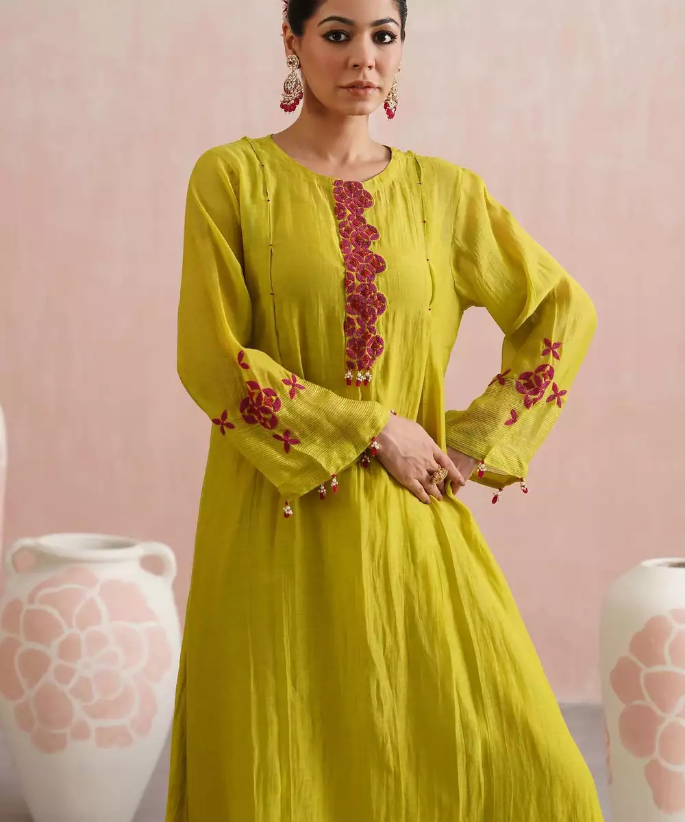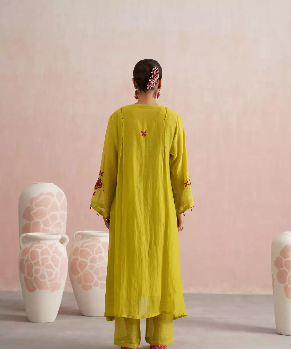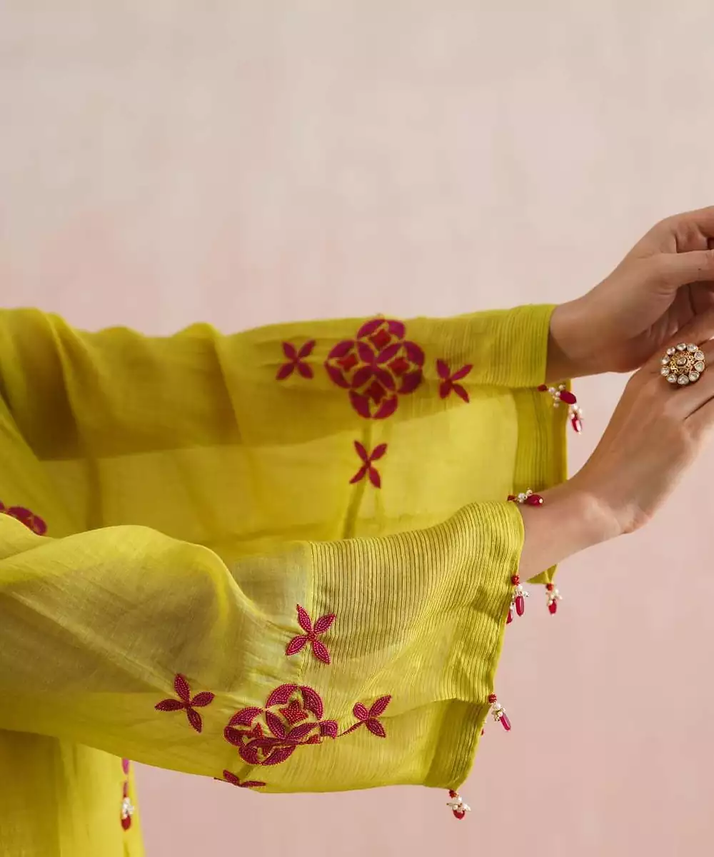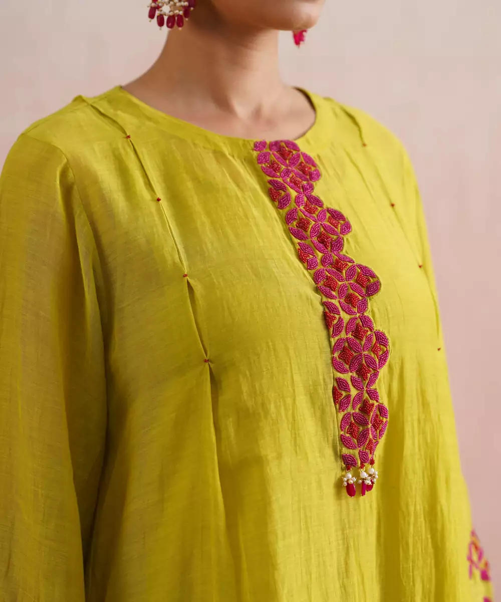 A Vibrant And Festive Ensemble, The Pakeezah Set Is Crafted In A Refreshing Lime Green Mul Chanderi Fabric, Making It Perfect For Intimate Occasions, Pujas, And Celebrations.The A Line Kurta Features Full Length Sleeves With Striped Chanderi Detailing, And Is Adorned With Hand Embroidered Geometric Motifs In Fuchsia And Maroon Beadwork. The Placket Opens With Hook And Eye Closures And Is Accented With Jewel Stone Hangings That Add A Festive Shimmer.