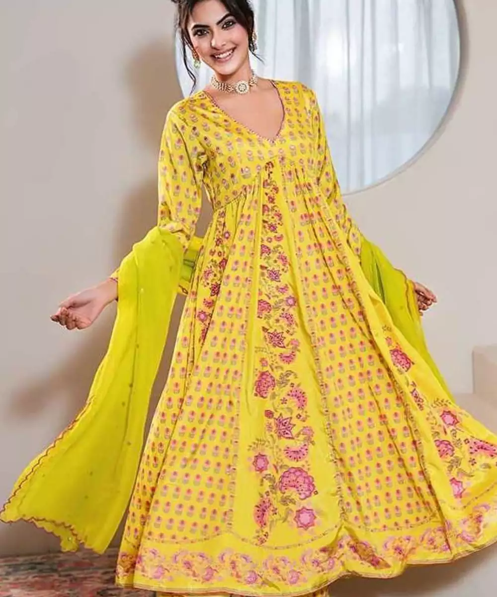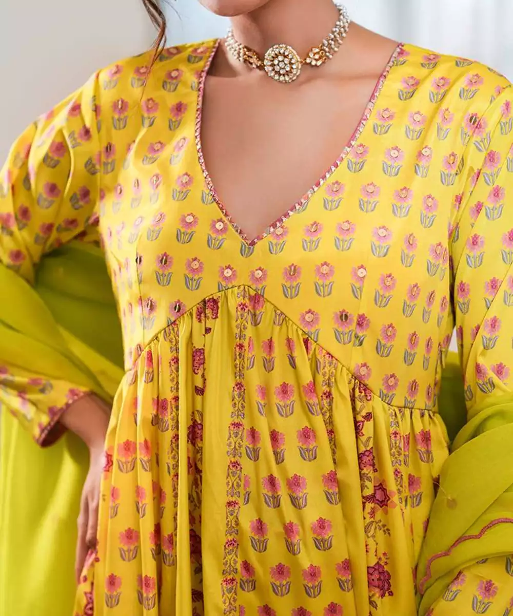 Step Into Timeless Grace With This Lime Printed Crepe Silk Naaz Mehrunissa Anarkali Set, Perfect For Making An Elegant Statement. The Kurta With A V Neckline And Full Sleeves Features Delicate Floral Embroidery That Spreads Across The Bodice And Flares Gracefully, Accentuating Its Flowing Silhouette. The Hem Is Adorned With Intricate Chintz Floral Borders, Adding A Hint Of Sophistication.