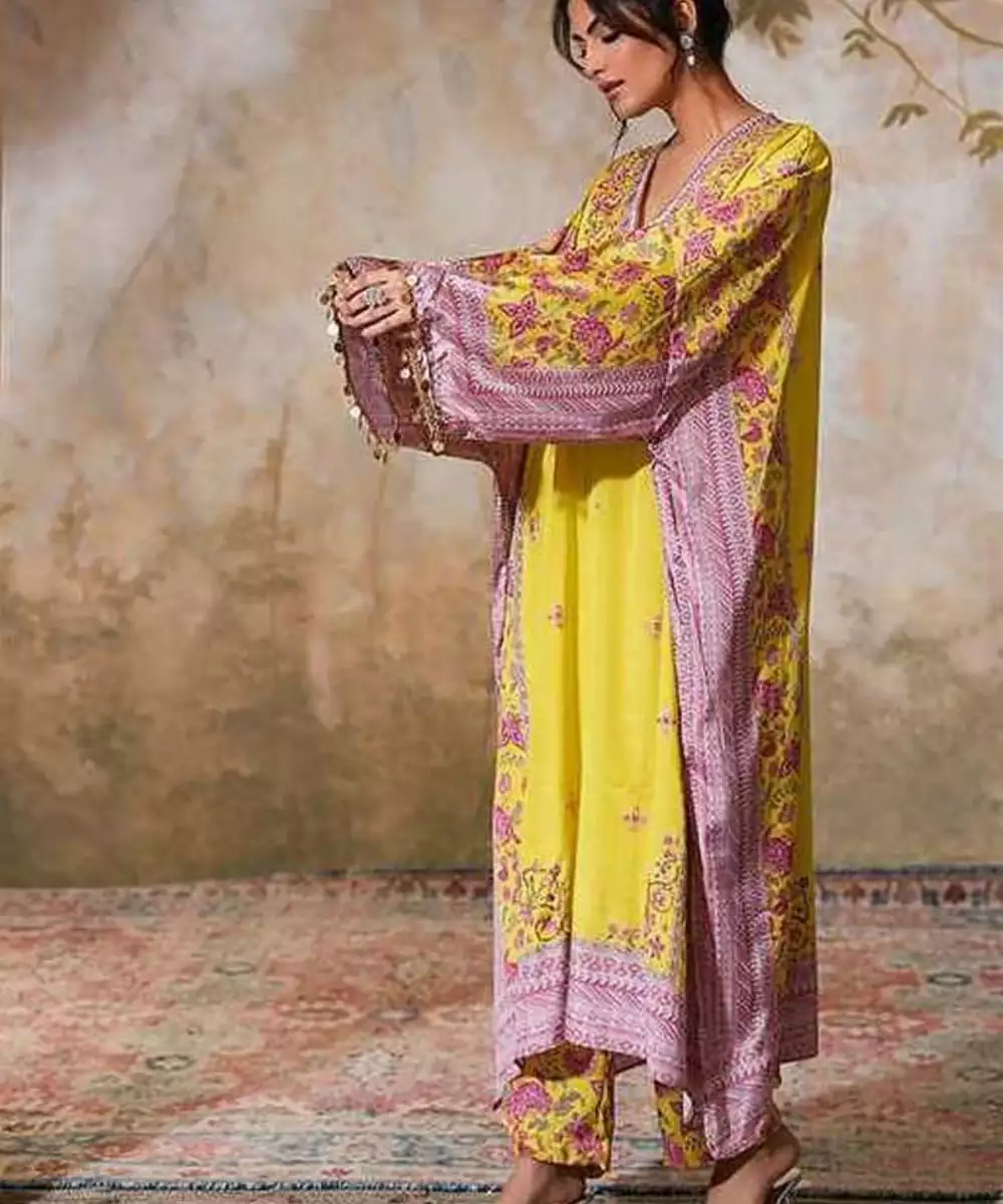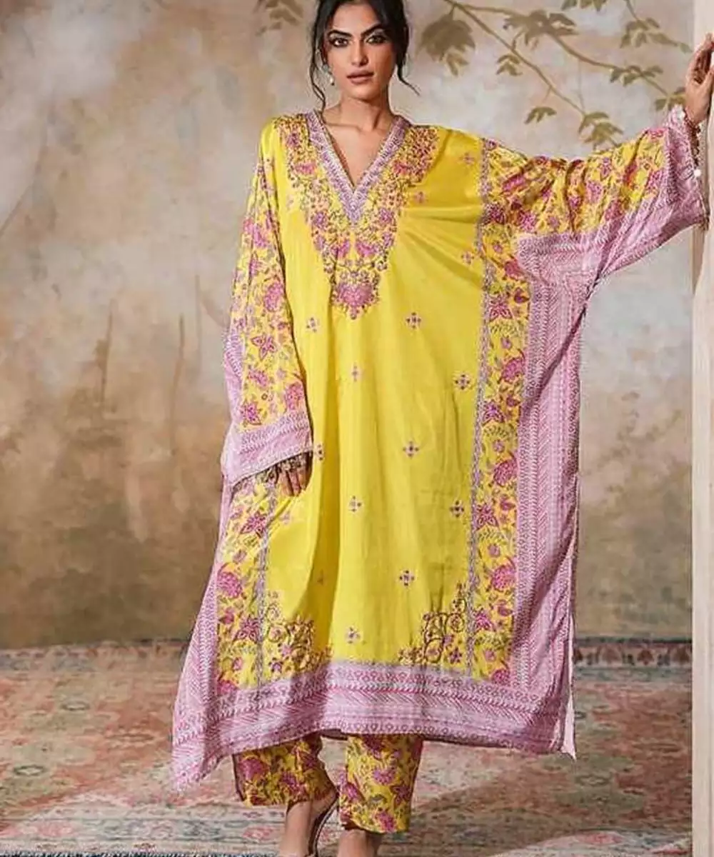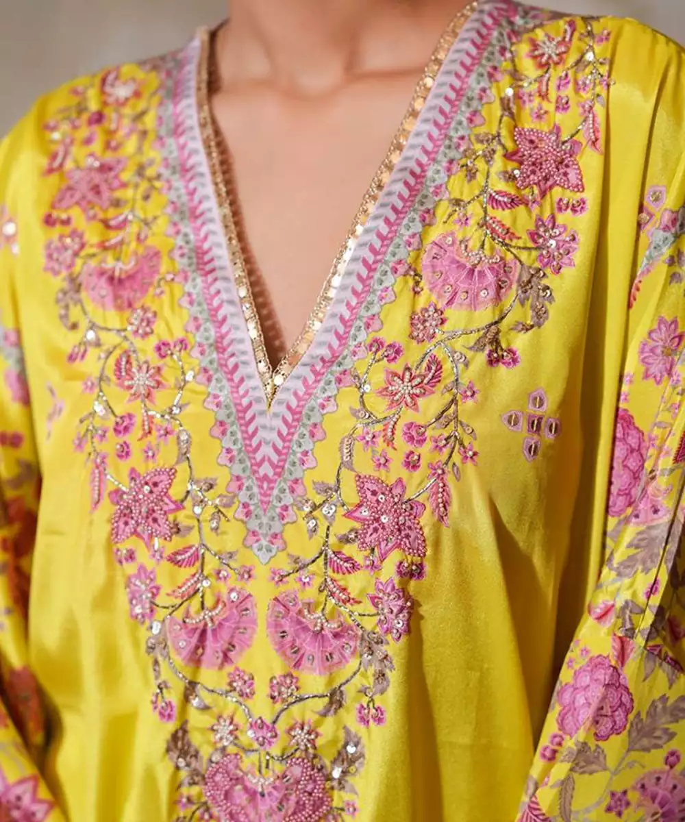 Can You Go Relaxed Chic In A Festive Avatar? Our Nargis Naayab Kaftan Set In A Lime Hue Gives You The Exact Notes To Keep It Comfortable While Dressing To The Occasion. Crafted From Luxurious, Glossy Crepe Silk Fabric, This Kaftan Is Adorned With A Harmonious Blend Of Chintz And Geometric Prints. Featuring A V Neckline Embellished With Intricate Lace Detailing, The Kaftan Is Further Elevated By Exquisite Beadwork, Pitta Hand Embroidery, And Delicate Pearl Embellishments.