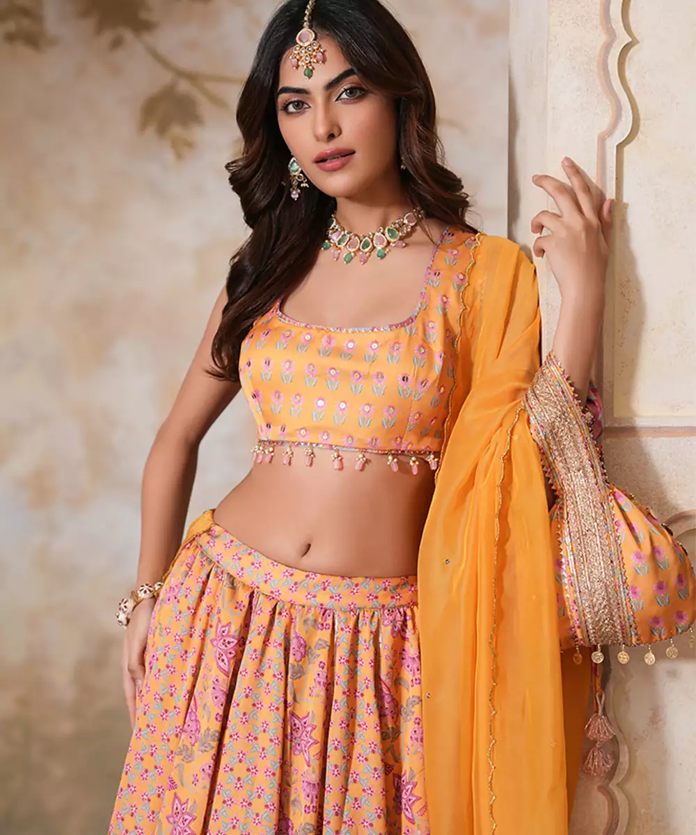 This Yellow Printed Crepe Lehenga With Dupatta Is Crafted In Lightweight, Flowy Crepe Fabric Featuring Vibrant All Over Prints. Paired With A Matching Choli And A Soft Dupatta, It Offers A Cheerful, Elegant Look Perfect For Festive Occasions, Daytime Weddings, And Celebrations.
