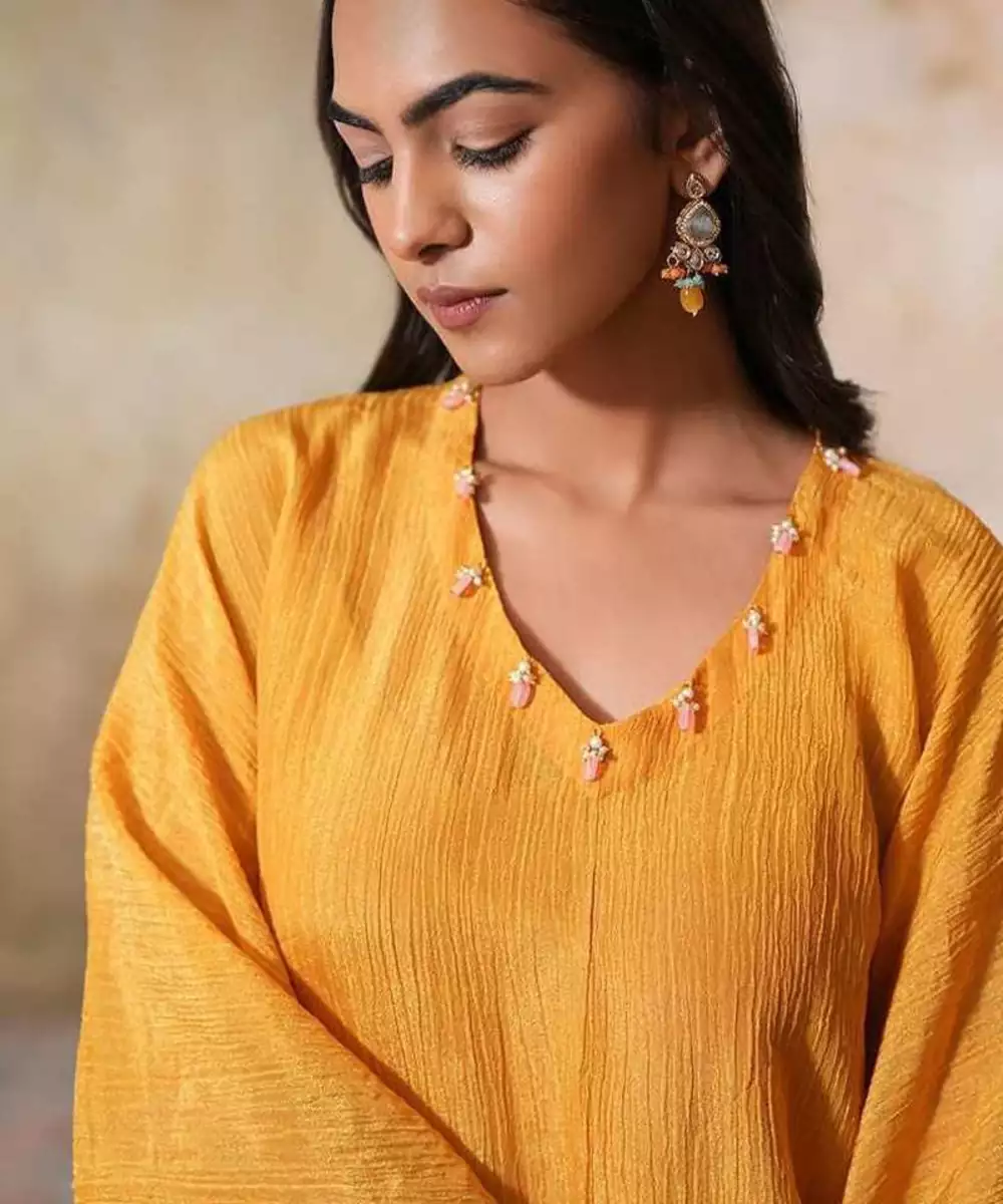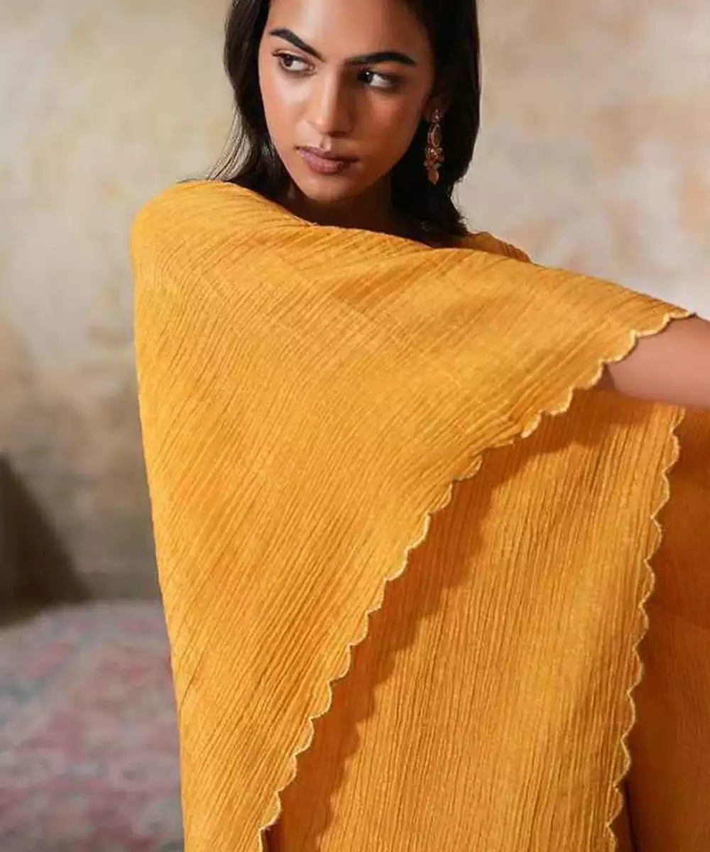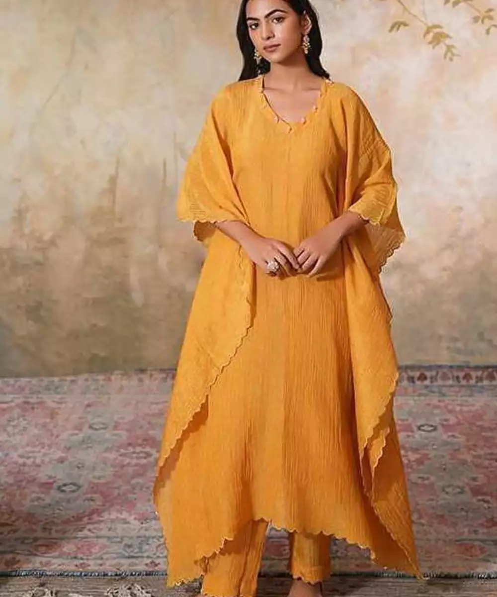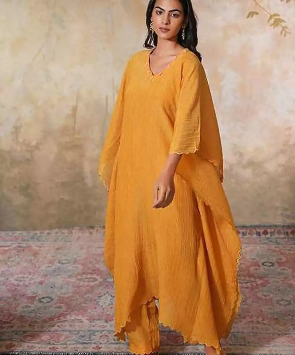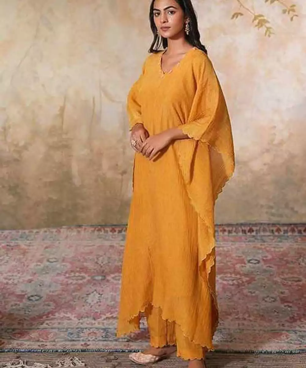 Make A Bold Statement With This Elegant Sunehra Tissue Silk Kaftan Set. The Flowing Kaftan, Crafted From Mustard Crushed Tissue Silk, Drapes Effortlessly, Offering Both Comfort And Style For The Upcoming Spring Summer Season. The Standout Feature Of This Kaftan Is The Intricate Gold Scallop Embroidery, Which Complements The Shimmer Of The Tissue Silk Fabric.
