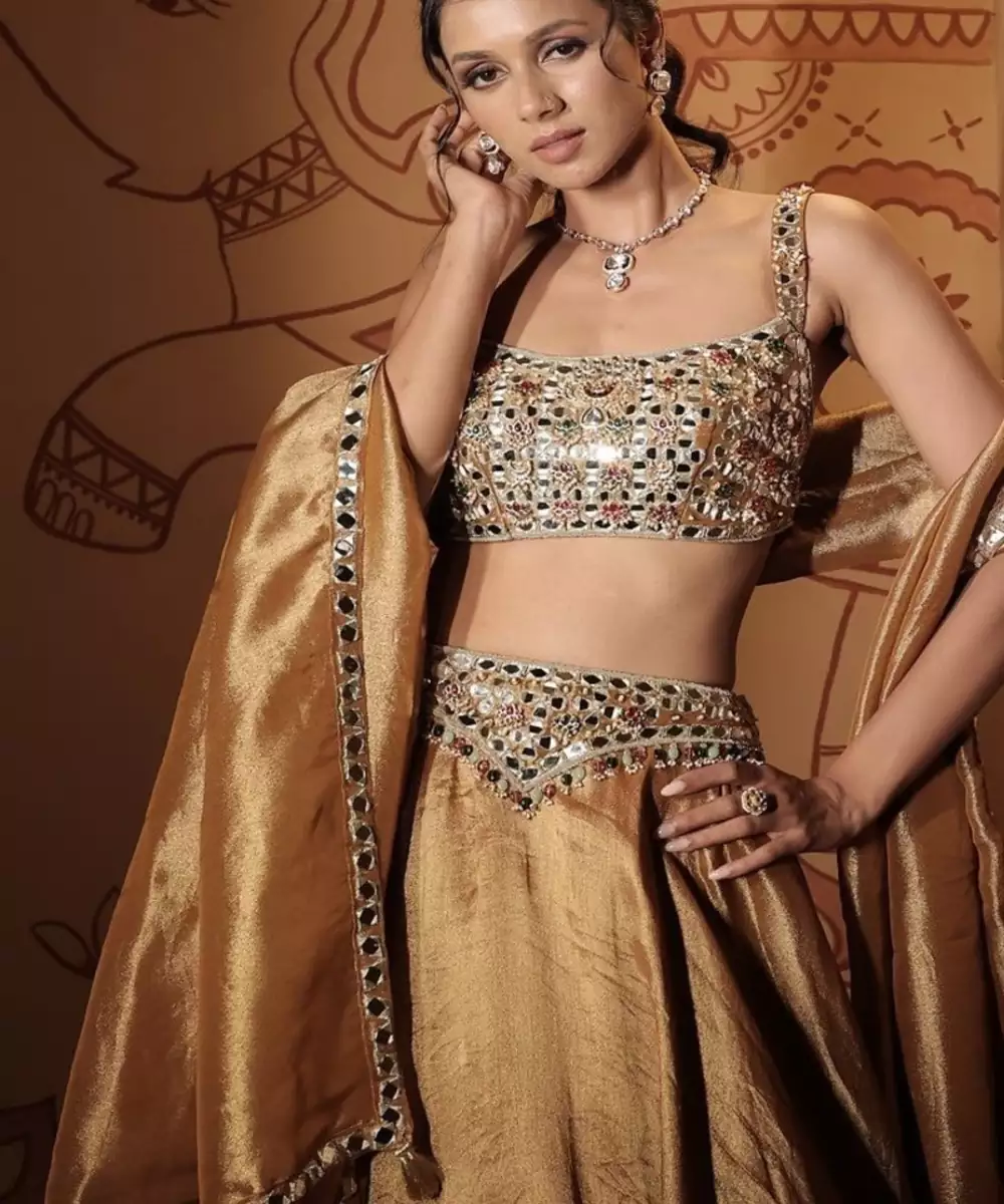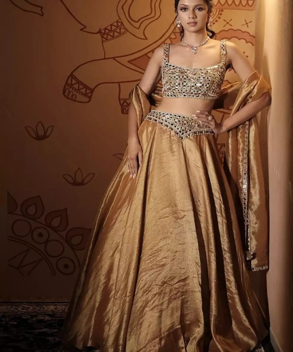 A Breathtaking Gold Silk Lehenga, Adorned With Intricate Gold And Silver Embroidery. This Traditional Indian Garment Features A Flared Skirt And A Matching Choli, Both Embellished With Delicate Floral And Paisley Motifs. The Set Is Completed By A Sheer Dupatta, Making It A Perfect Ensemble For Weddings, Festivals, Or Special Occasions