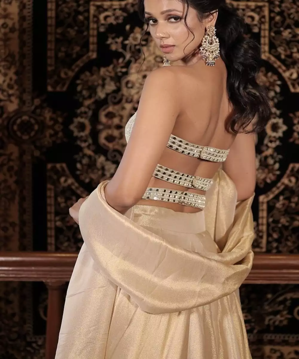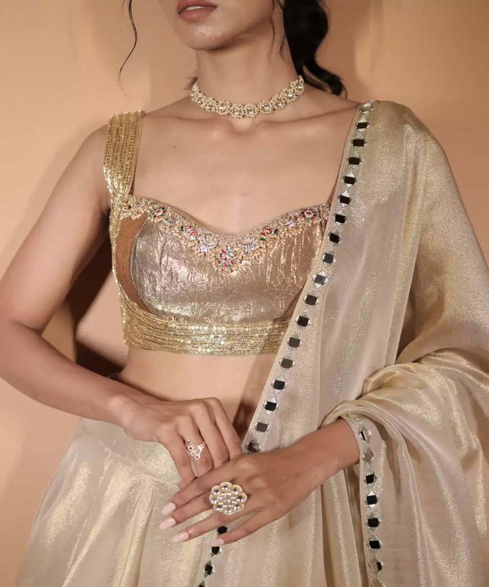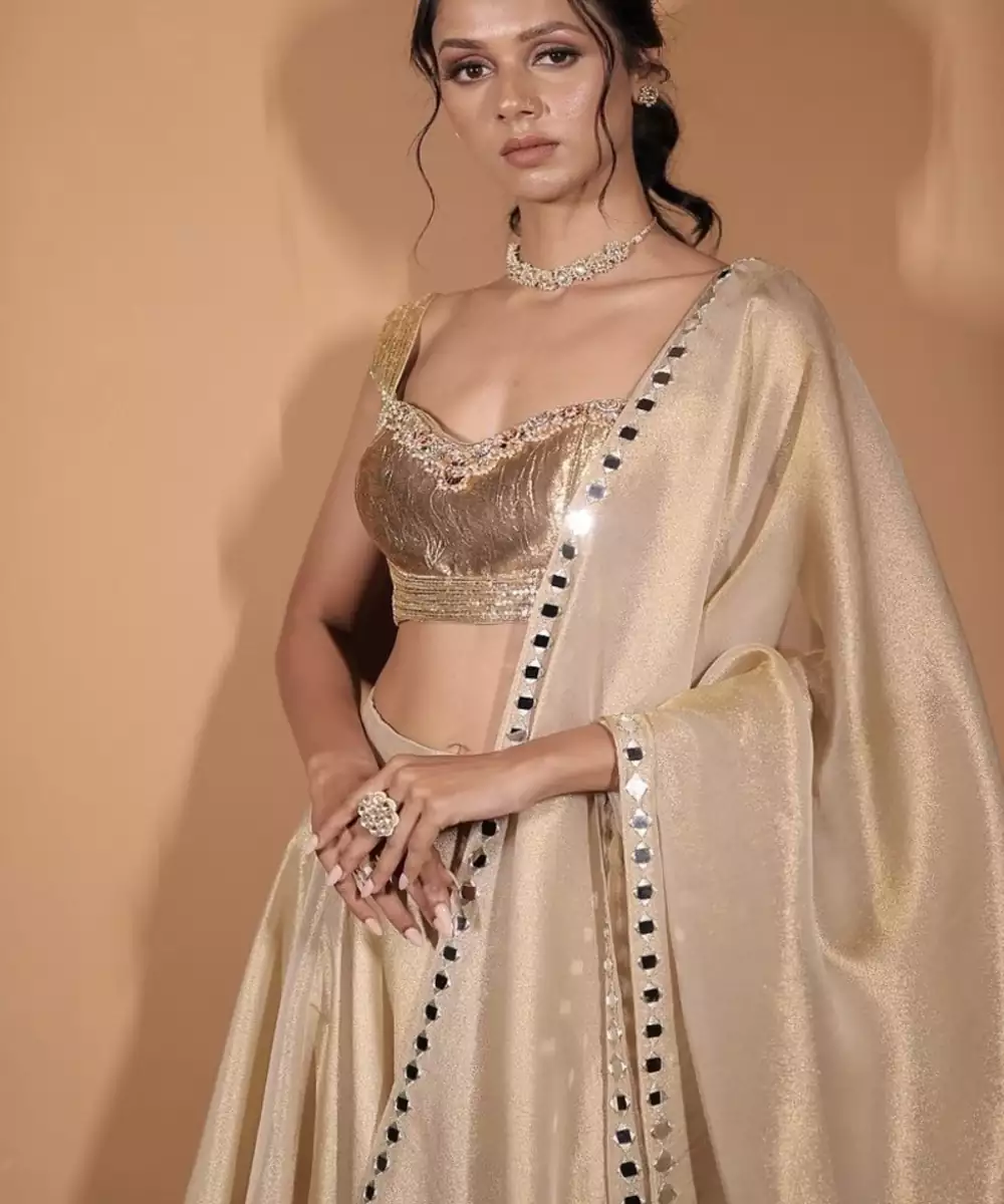 A Breathtaking Ivory Silk Lehenga, Adorned With Intricate Gold And Silver Embroidery. This Traditional Indian Garment Features A Flared Skirt And A Matching Choli, Both Embellished With Delicate Floral And Paisley Motifs. The Set Is Completed By A Sheer Dupatta, Making It A Perfect Ensemble For Weddings, Festivals, Or Special Occasions