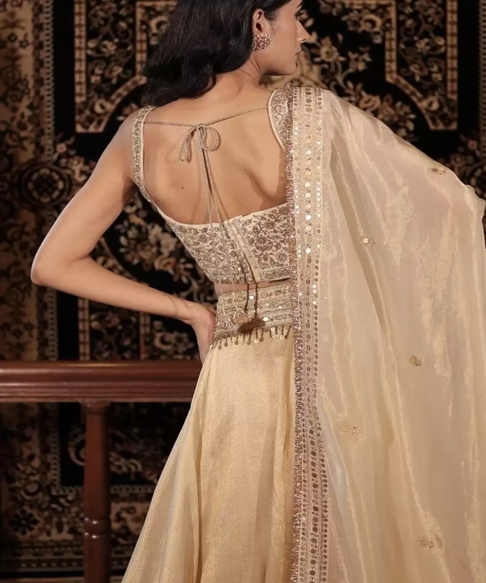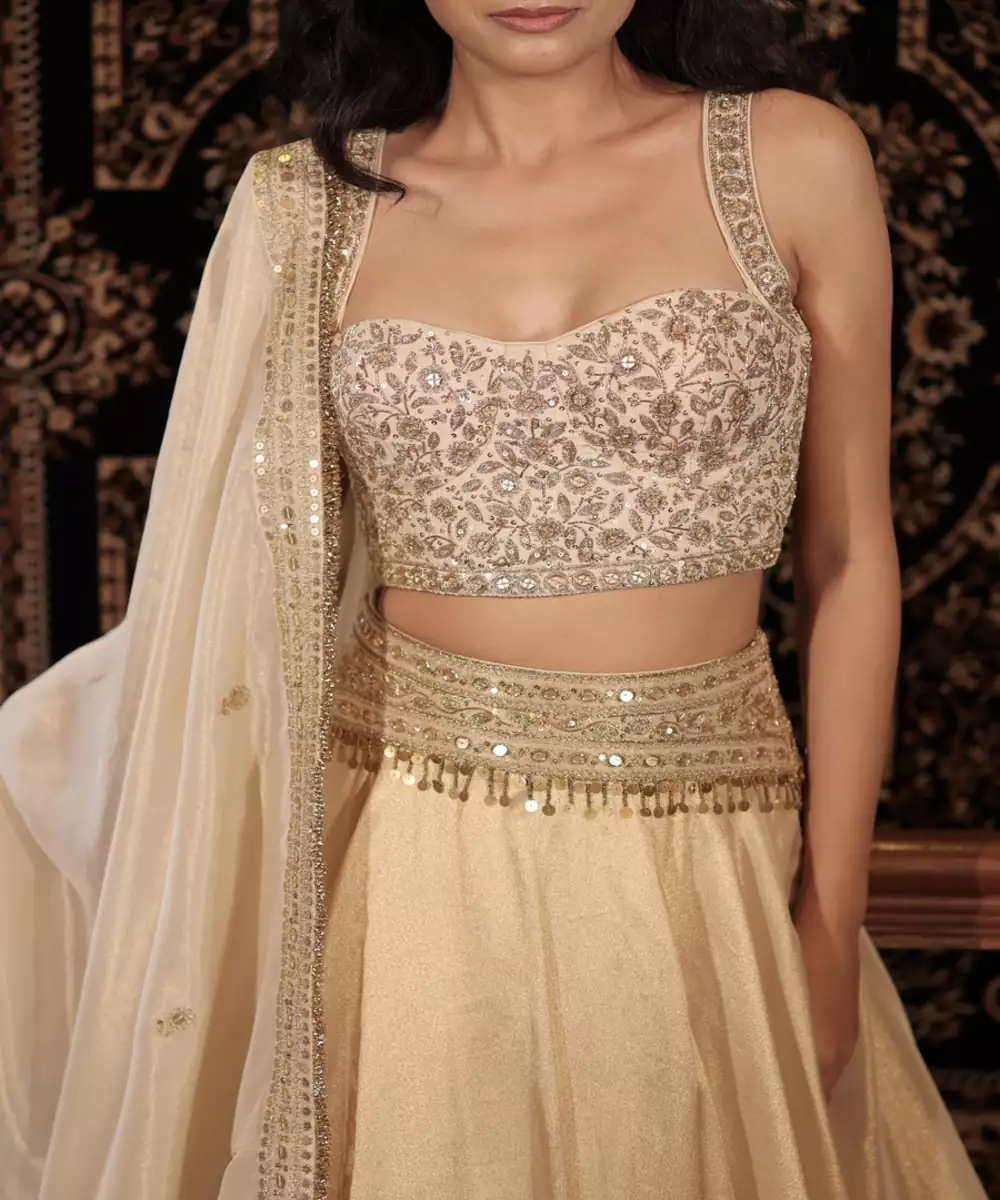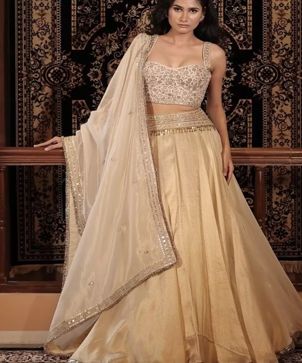 A Breathtaking Ivory Silk Lehenga, Adorned With Intricate Gold And Silver Embroidery. This Traditional Indian Garment Features A Flared Skirt And A Matching Choli, Both Embellished With Delicate Floral And Paisley Motifs. The Set Is Completed By A Sheer Dupatta, Making It A Perfect Ensemble For Weddings, Festivals, Or Special Occasions