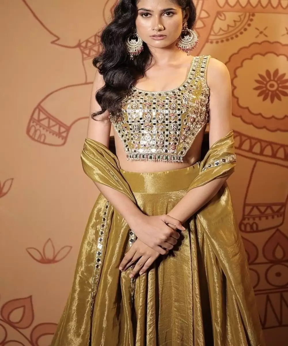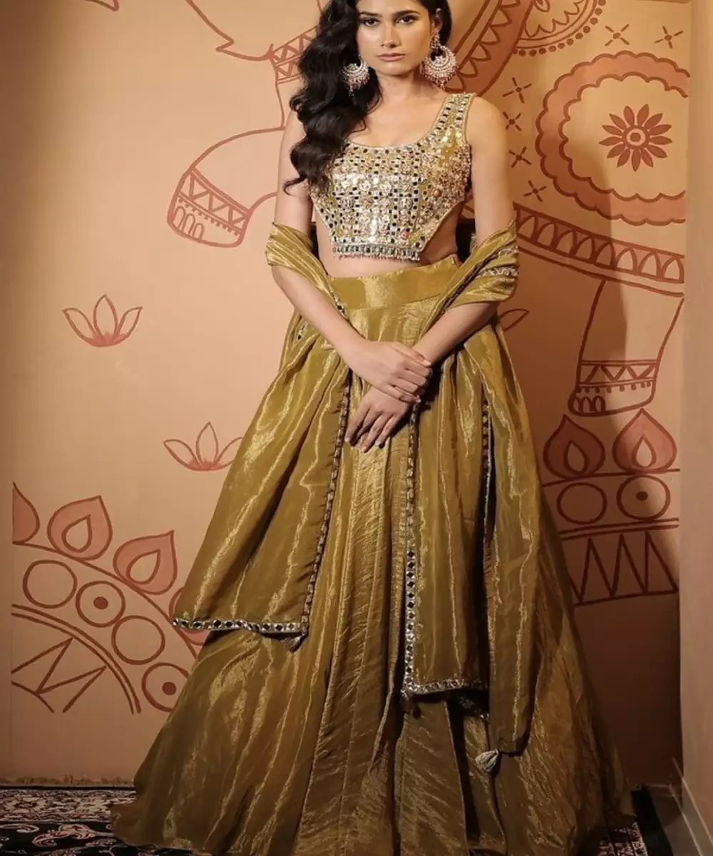 A Breathtaking Olive Silk Lehenga, Adorned With Intricate Gold And Silver Embroidery. This Traditional Indian Garment Features A Flared Skirt And A Matching Choli, Both Embellished With Delicate Floral And Paisley Motifs. The Set Is Completed By A Sheer Dupatta, Making It A Perfect Ensemble For Weddings, Festivals, Or Special Occasions