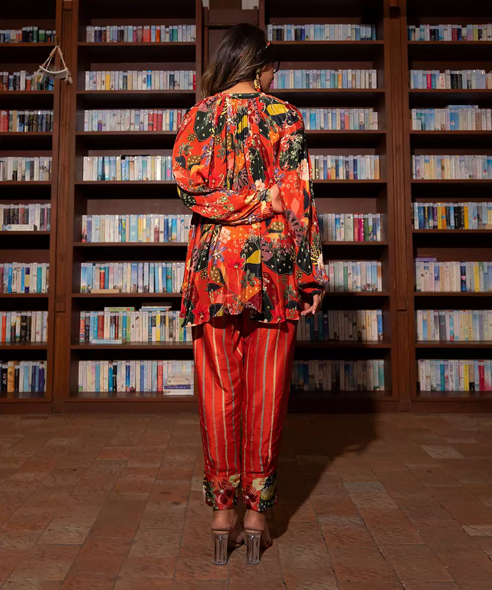 Featuring Viscose Base Printed Hand Embroidered Gathered Shirt With Lace Details Along With Silk Base Striped Printed Cuff Pants.