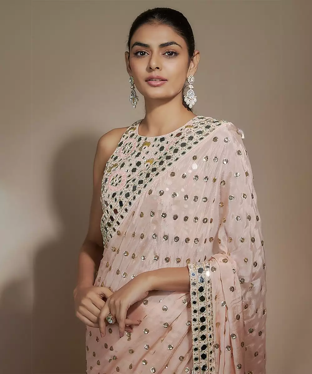Featuring A Peach Saree In Chinon Base With Sequins And Mirror Hand Embroidery. It Is Paired With A Blouse. Accentuate With Statement Jewellery And Heels For A Festive Occasion Or Engagement Ceremony.