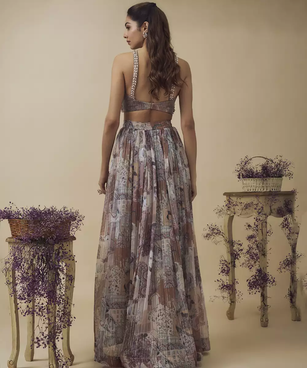 Printed Lurex Chiffon Hand Embroidered Bustier Along With Asymetric Gathered Skirt And Embroidered Net Dupatta Colour: Beige Fabric: Cotton Components : 1 Skirt / 1 Bustier / 1 Dupatta