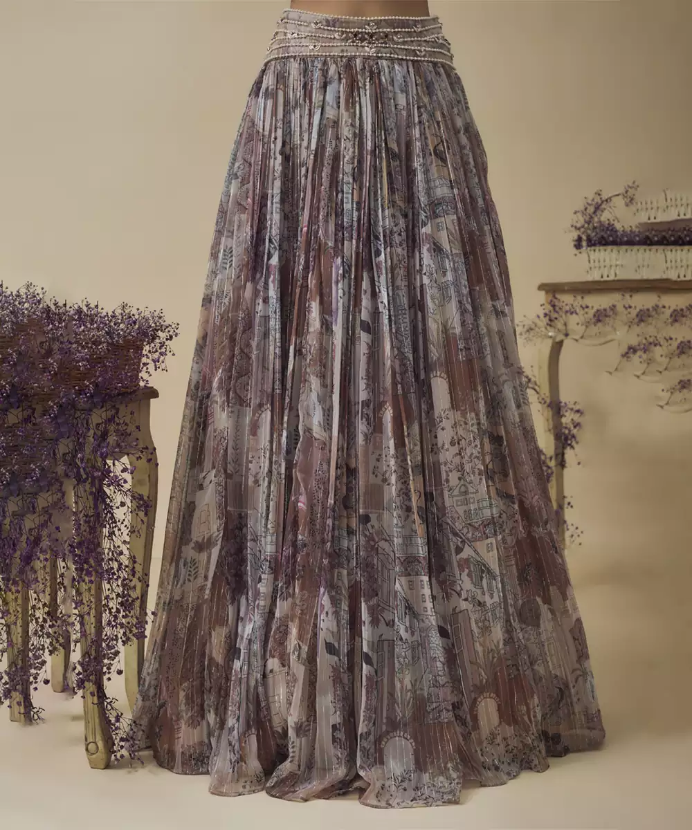 Printed Lurex Chiffon Hand Embroidered Corset Along With Gathered Lehenga And Embroidered Net Dupatta Colour: Beige Fabric: Chiffon Components : 1 Lehenga / 1 Blouse / 1 Dupatta