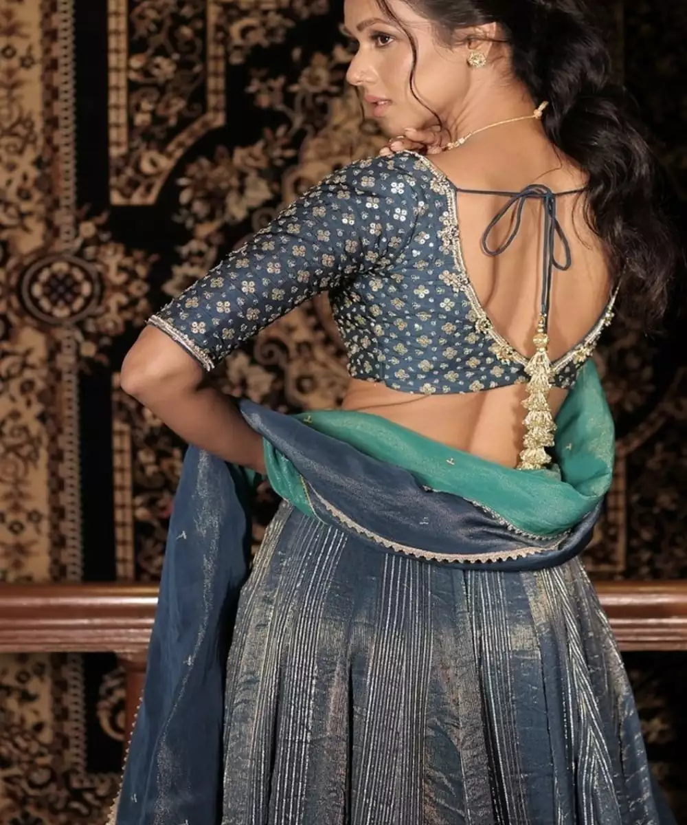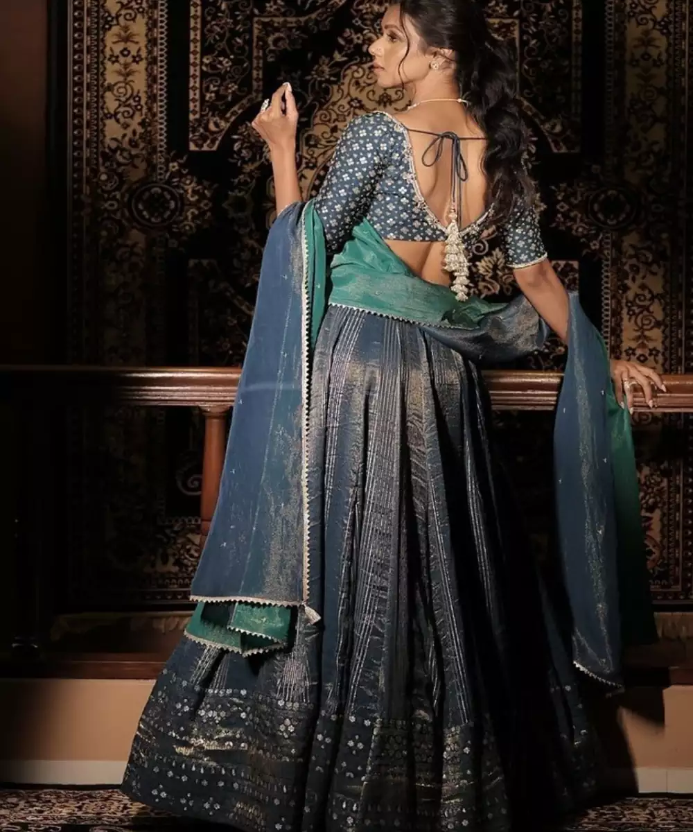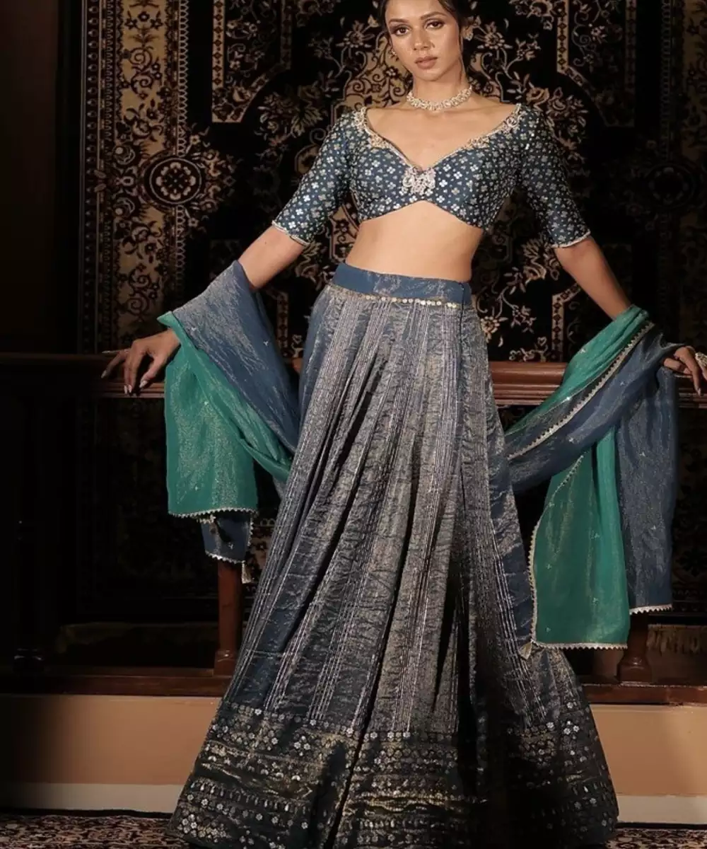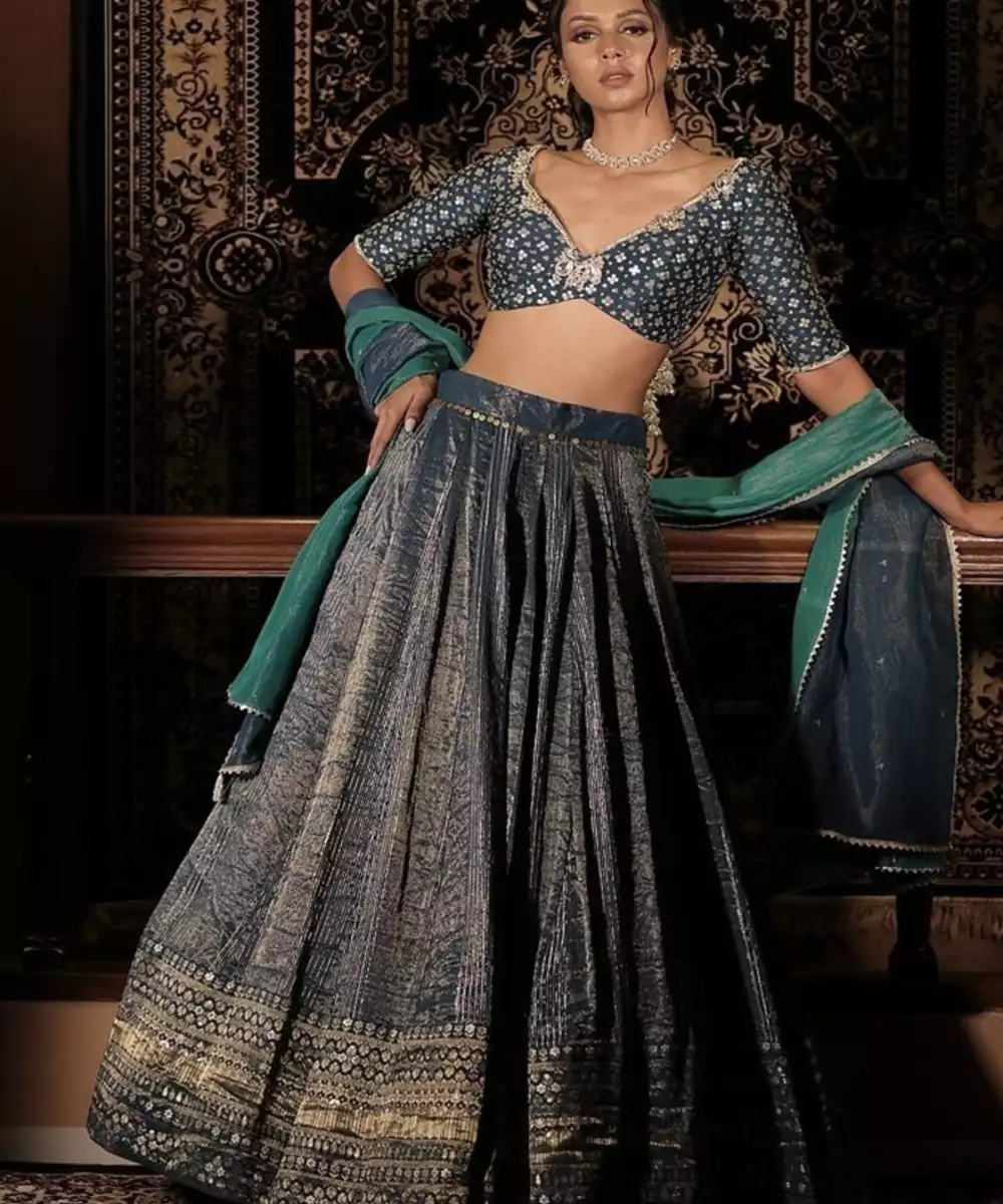 A Breathtaking Teal Blue Silk Lehenga, Adorned With Intricate Gold And Silver Embroidery. This Traditional Indian Garment Features A Flared Skirt And A Matching Choli, Both Embellished With Delicate Floral And Paisley Motifs. The Set Is Completed By A Sheer Dupatta, Making It A Perfect Ensemble For Weddings, Festivals, Or Special Occasions