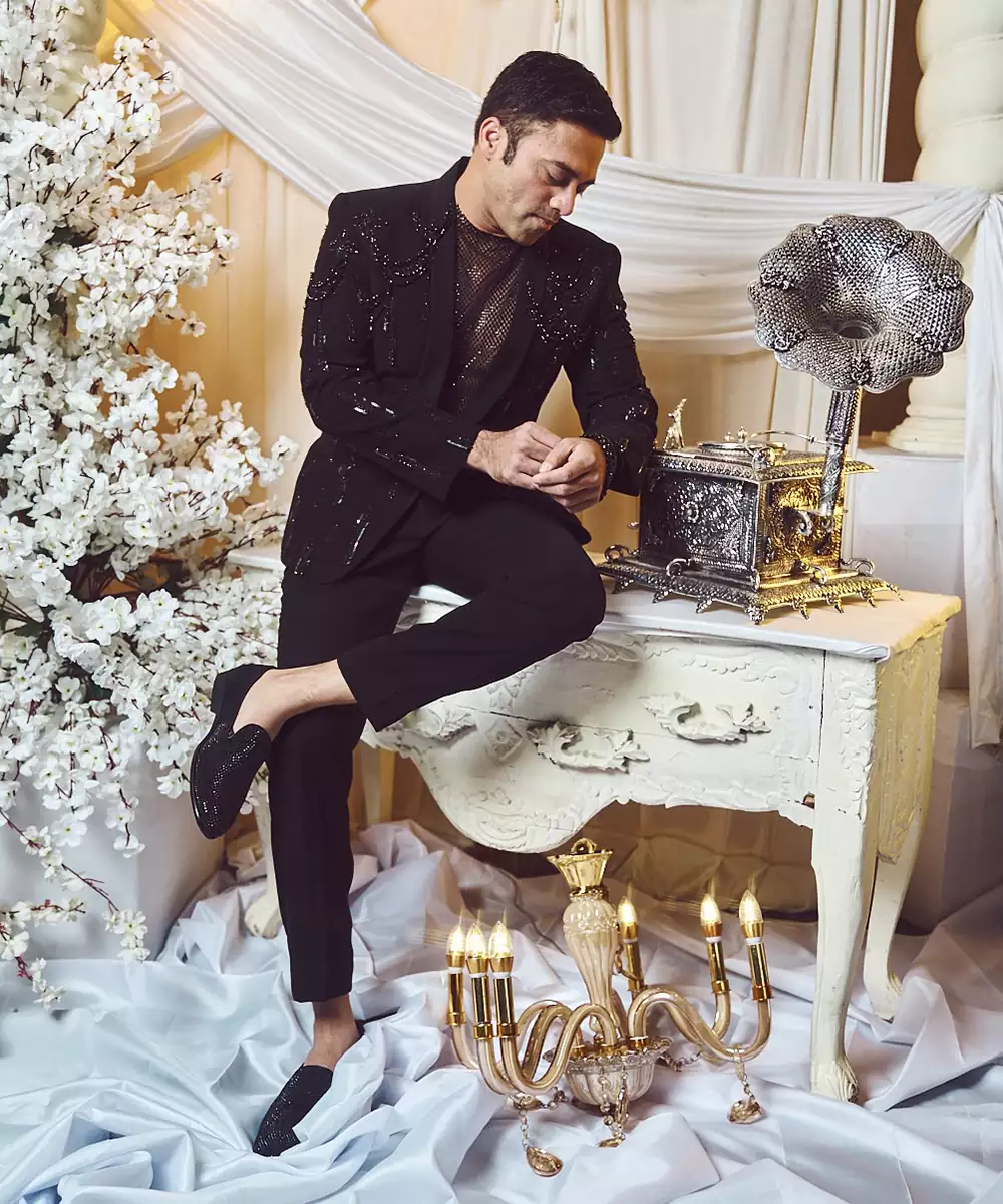 Ebony Black Chandelier Blazer Set In With Glass Beads And Stones And Is Paired Up With A Rhinestone Top Inside.