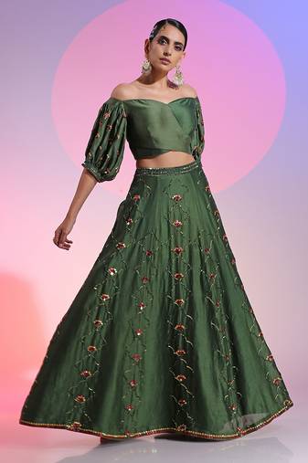 Emerald Green Wrap Style Blouse With Layered Skirt Set Enhanced With Floral Motifs In A Tonal Aesthetic.
