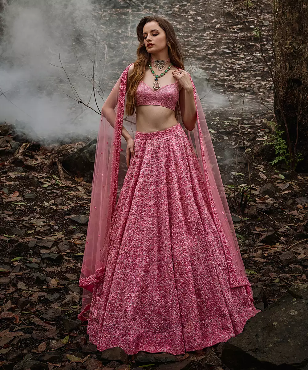 Pink Prism Lehenga With Geometric Beads Adorn This Lehenga Set, Blouse & Dupatta. Color: Pink Fabric : Organza Components: 3 ( Lehenga,Blouse,Dupatta) Work: Embroidery