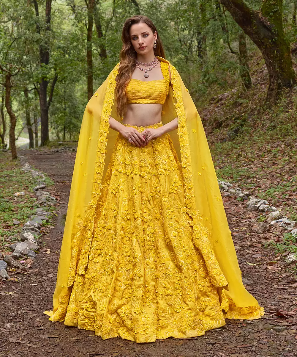 Sunlight Lehenga With 3 D Florals Bloom On This Lehenga With Matching Dupatta & An Embroidered Blouse With Sleeve Embellishments.