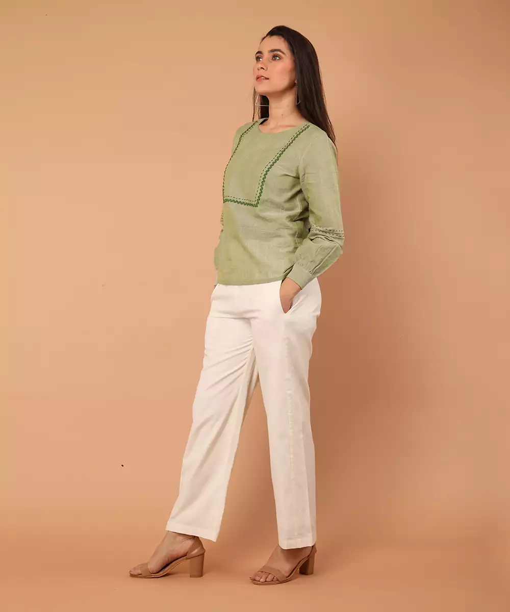 Straight Fit Top In Handloom Cotton With Details Of Hand Kantha And Zig Zag Lace On Yoke. Thin Pintuck And Hand Kantha On Sleeves. Top Is Paired With An Off White, Straight Fit Trousers In Handloom Cotton From Sambalpur.