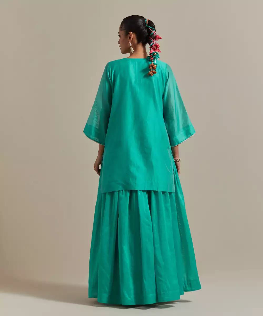 Chanderi Handloom Short Kurta Has An Embroidered Neckline And Delicate Lace Details On The Sleeves. Its Paired With A Matching Chanderi Gathered Skirt In Aqua. Perfect Ensemble That’s Comfortable And Elegant For Festivities.