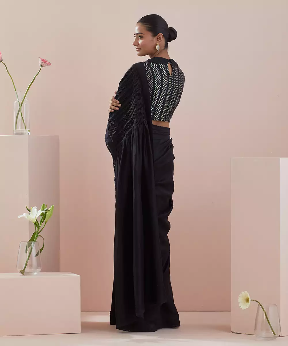 Black Saree In Handwoven Chanderi With Pin Tucks On The Pallu Giving It Natural Gathers And Drape. The Saree Comes With A Blouse Piece In Textured Cotton With Multicolored Weave. A Smart, Fuss Free Saree For Formal