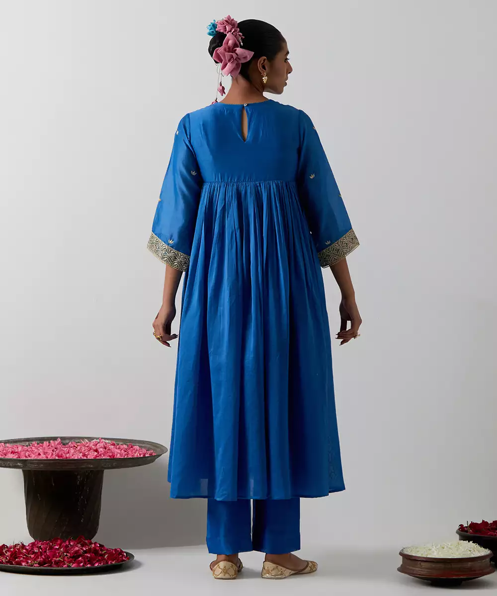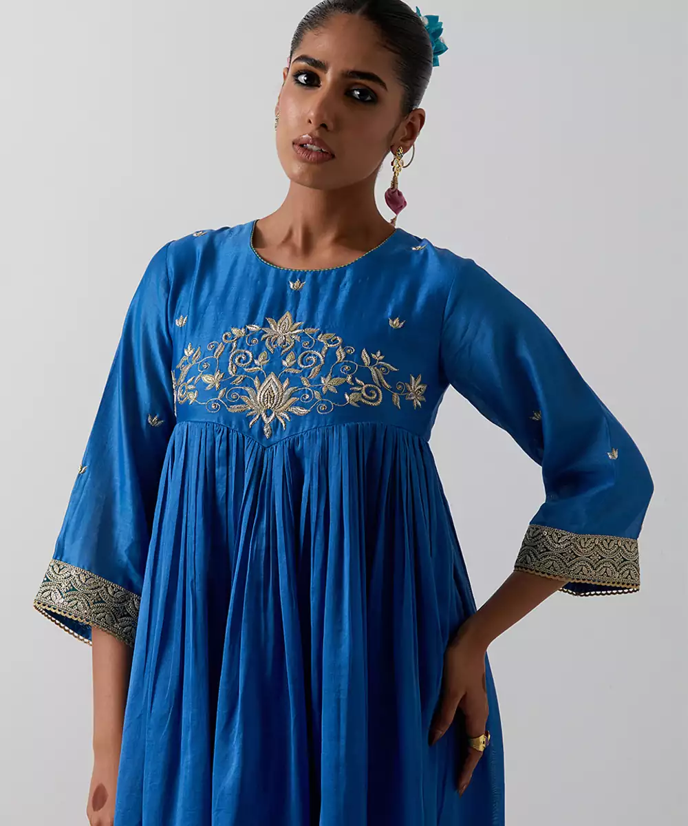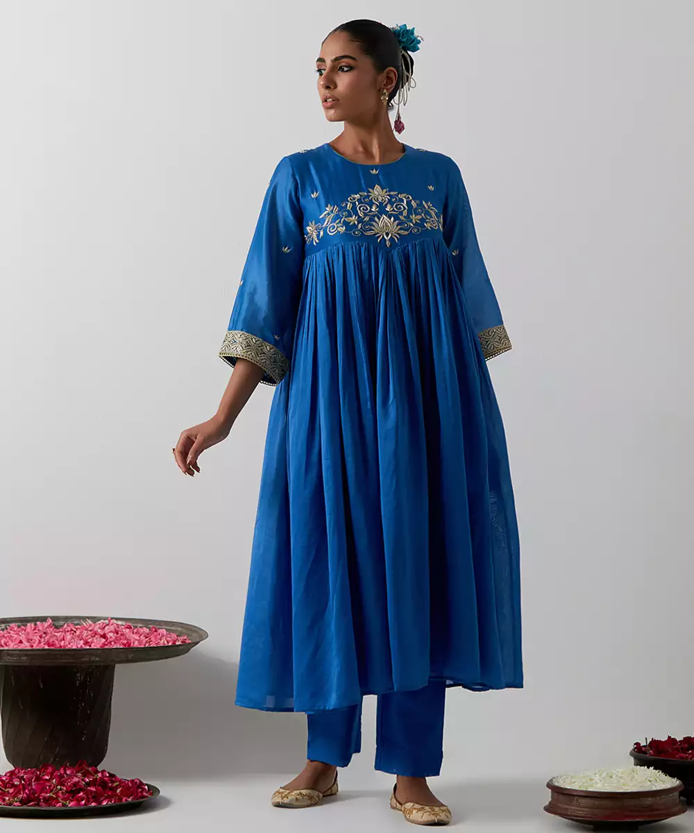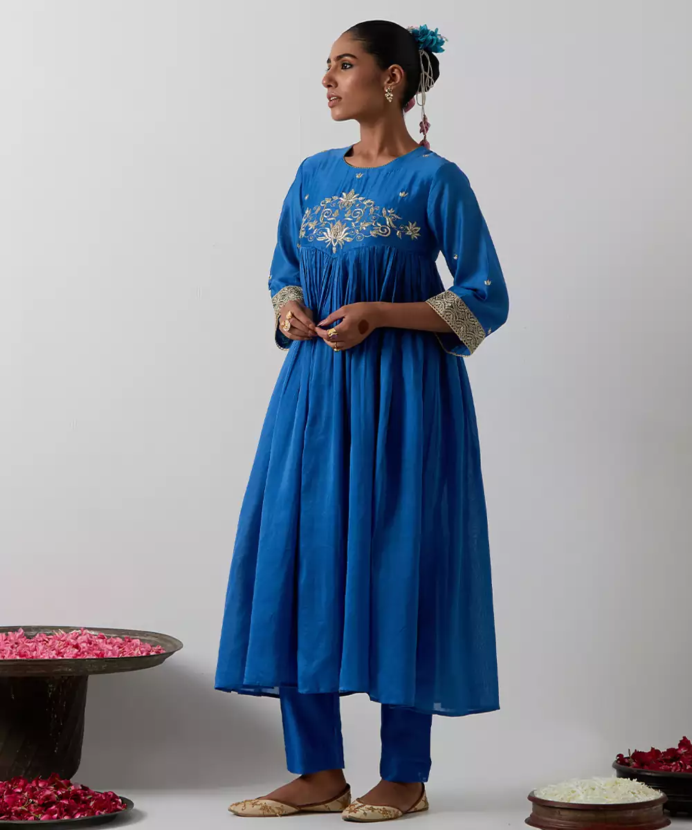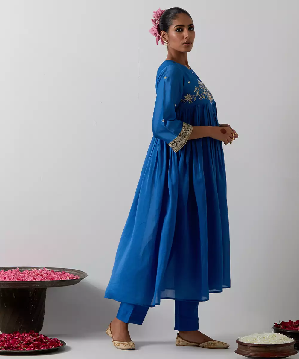 This Blue Embroidered Chanderi Anarkali Set Showcases Timeless Elegance With Its Rich Hue And Intricate Detailing. Crafted From Luxurious Chanderi Fabric, It Offers A Graceful Flow And Lightweight Comfort. The Delicate Embroidery Enhances Its Festive Appeal, Making It Perfect For Weddings, Celebrations, And Special Occasions. A Sophisticated And Charming Traditional Ensemble.