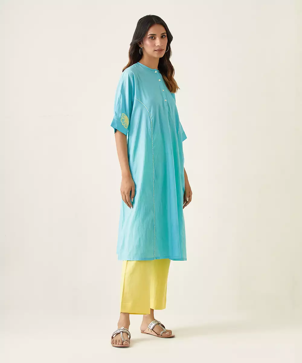 Loose Kaftan Style Kurta In Pastel Blue Cotton Has Contrast Yellow Embroidery On The Sleeves And The Front, A Box Pleat At The Back Highlighted With Kantha Stitches, And Front Button Details. Lt's Paired With Maize Yellow Straight Pants In Cotton Glaze. An Outfit In Fresh Colors, That's Fuss Free & Comfortable; Designed For A Full Day In The Office.