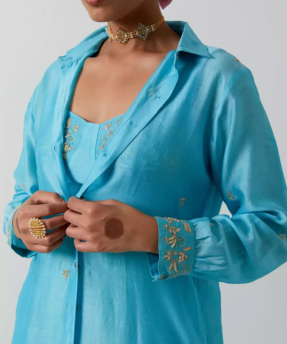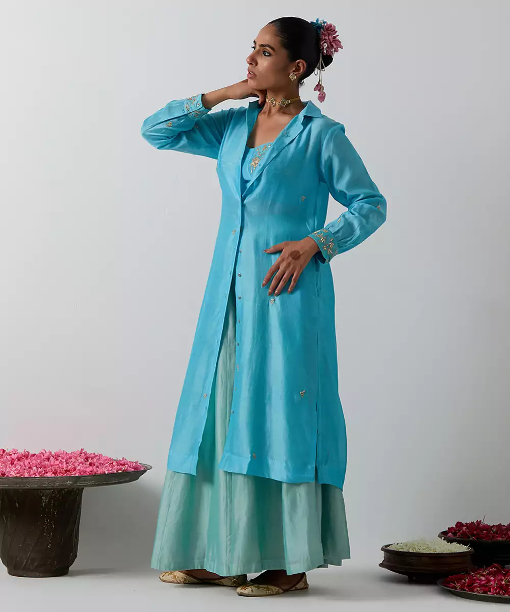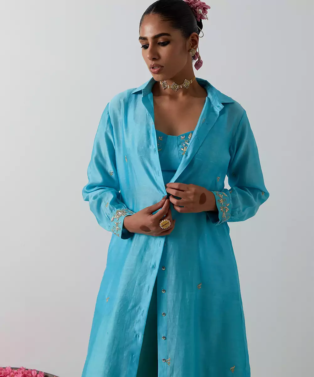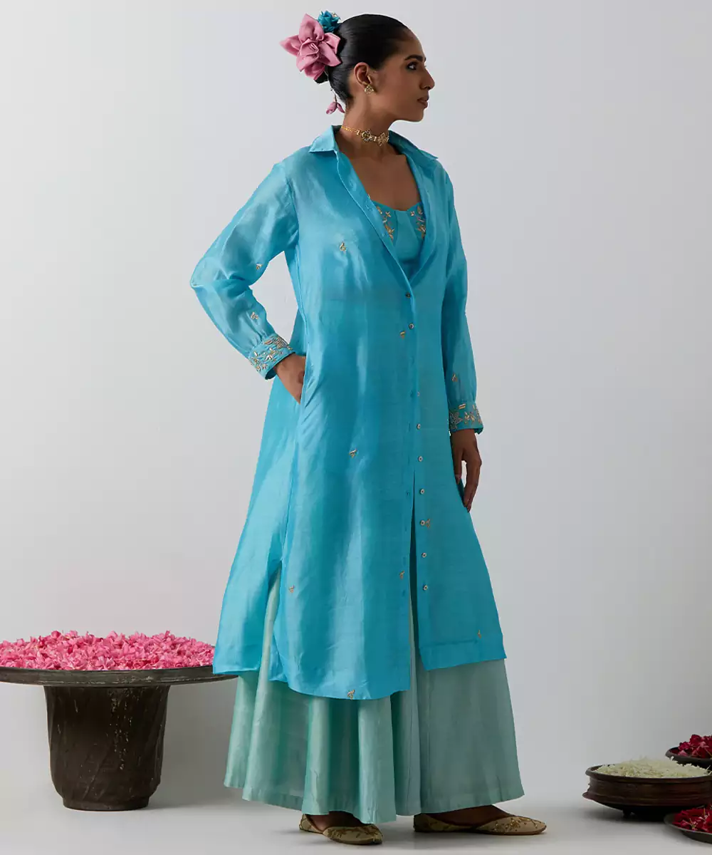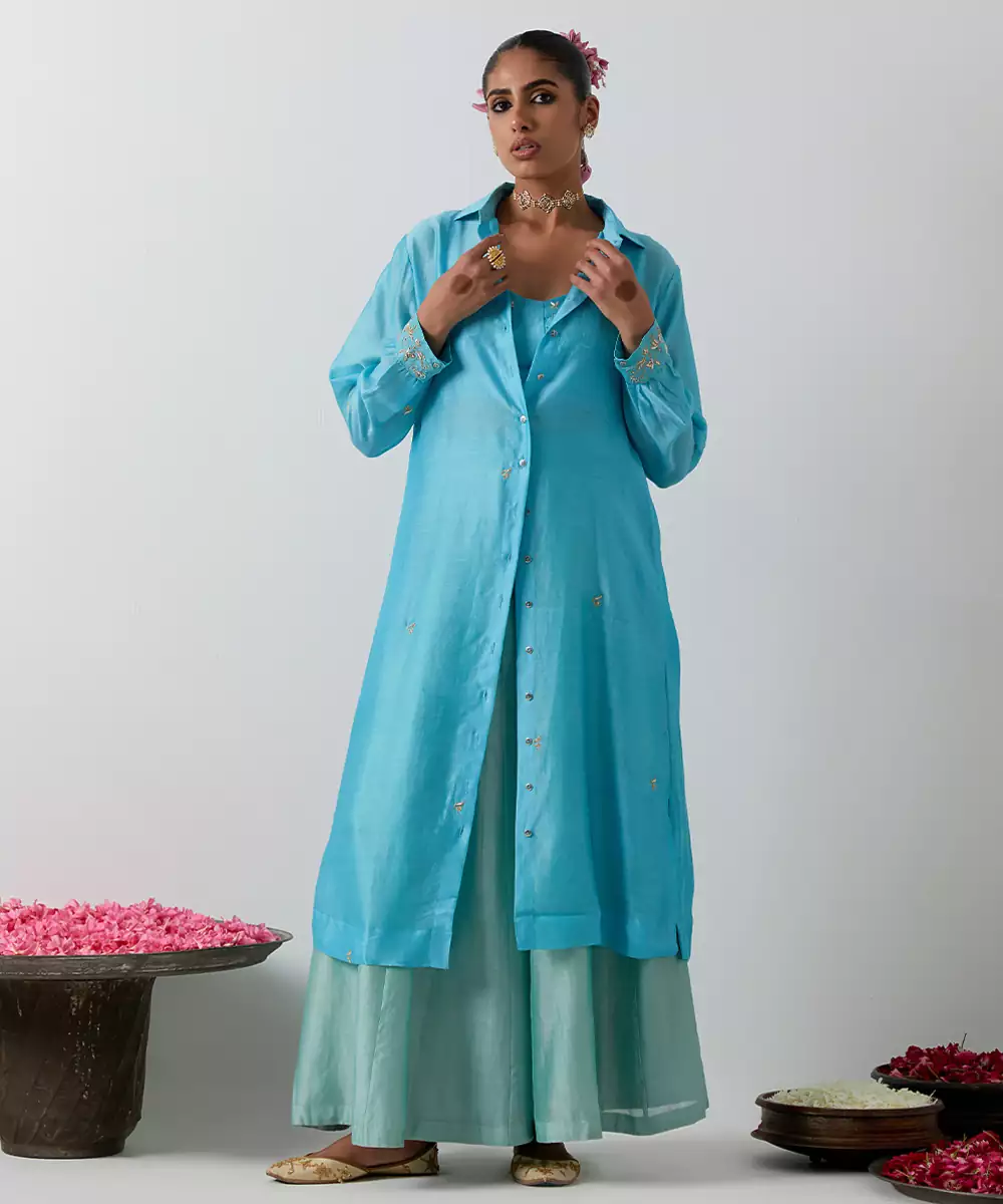 This Blue Plain Chanderi Co Ord Set Combines Minimal Elegance With Modern Style. Crafted From Soft, Lightweight Chanderi Fabric, It Offers A Subtle Sheen And A Refined Silhouette. Perfect For Festive Gatherings, Casual Celebrations, Or Daytime Events, This Coordinated Ensemble Delivers Effortless Sophistication With A Comfortable And Contemporary Appeal.