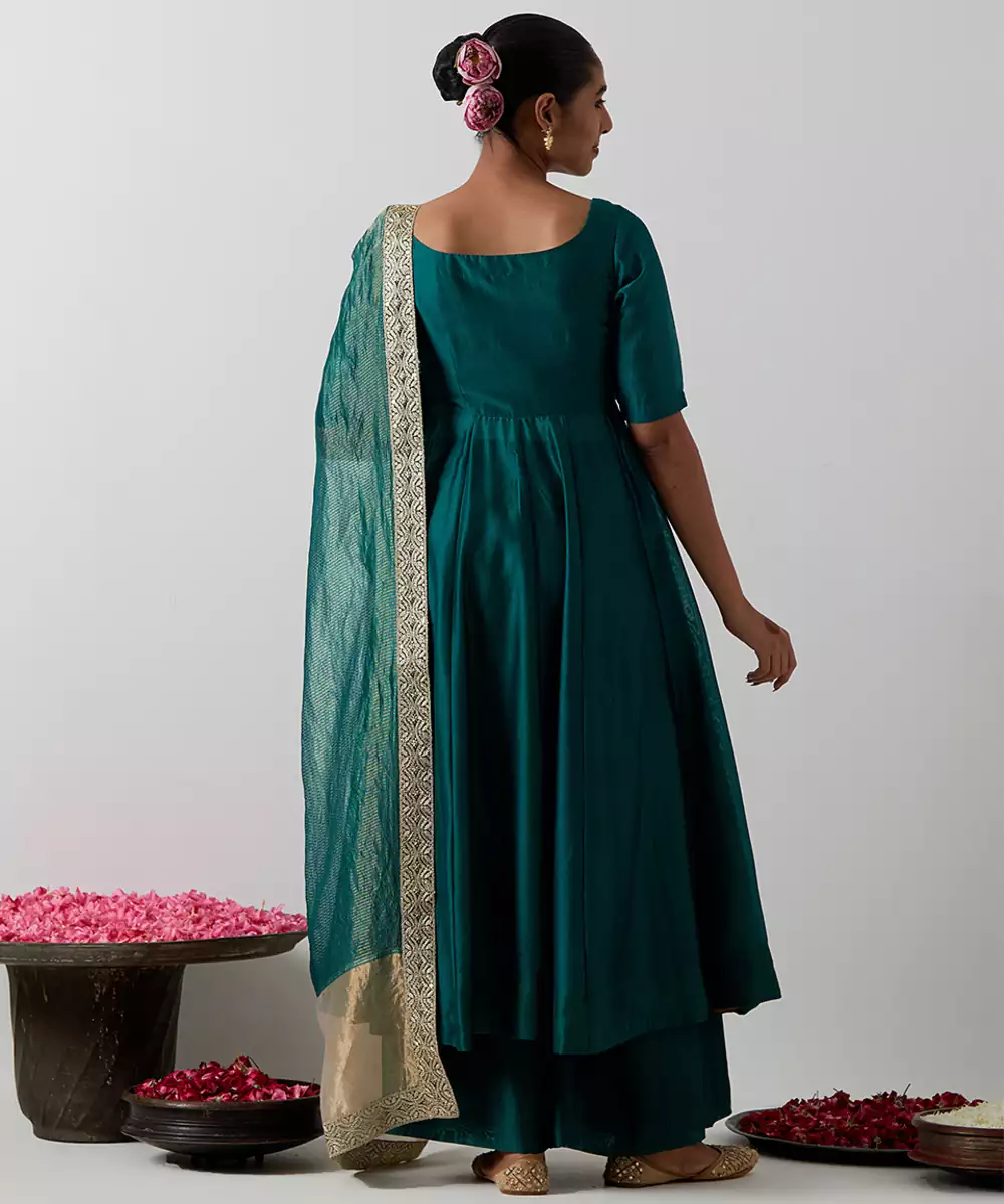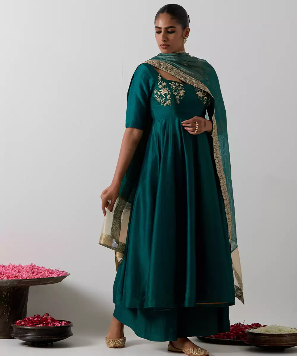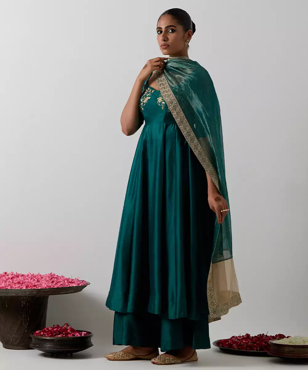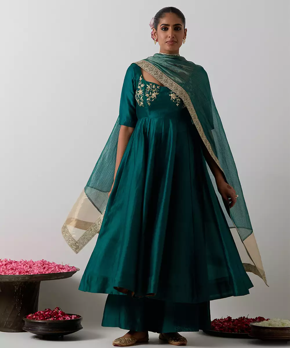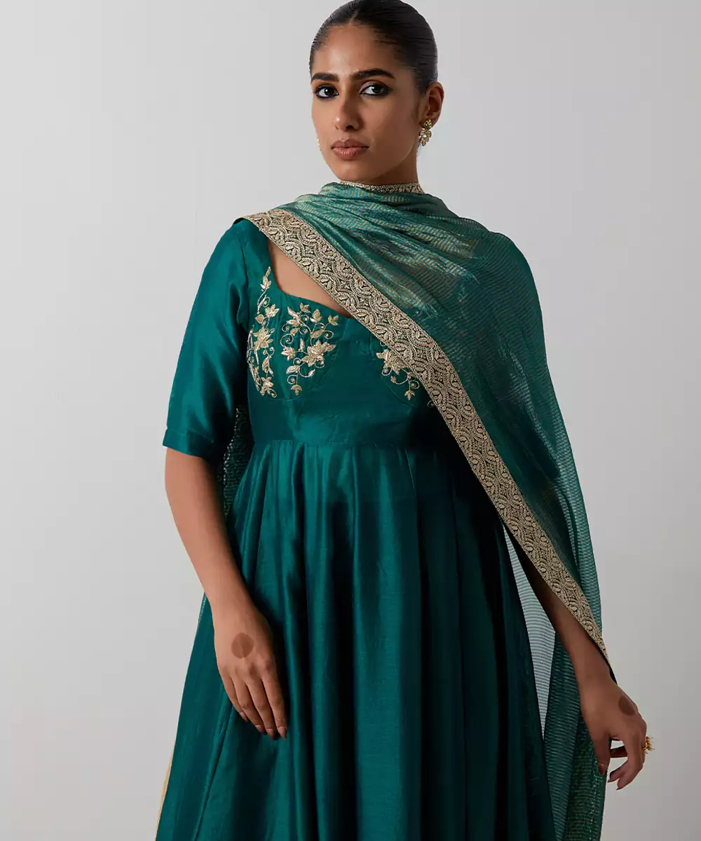 This Green Embroidered Chanderi Anarkali Set Showcases Timeless Elegance With Its Rich Hue And Intricate Detailing. Crafted From Luxurious Chanderi Fabric, It Offers A Graceful Flow And Lightweight Comfort. The Delicate Embroidery Enhances Its Festive Appeal, Making It Perfect For Weddings, Celebrations, And Special Occasions. A Sophisticated And Charming Traditional Ensemble.