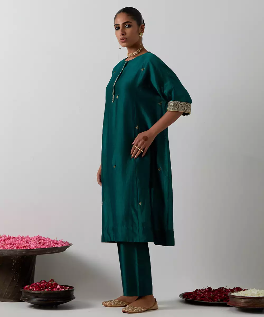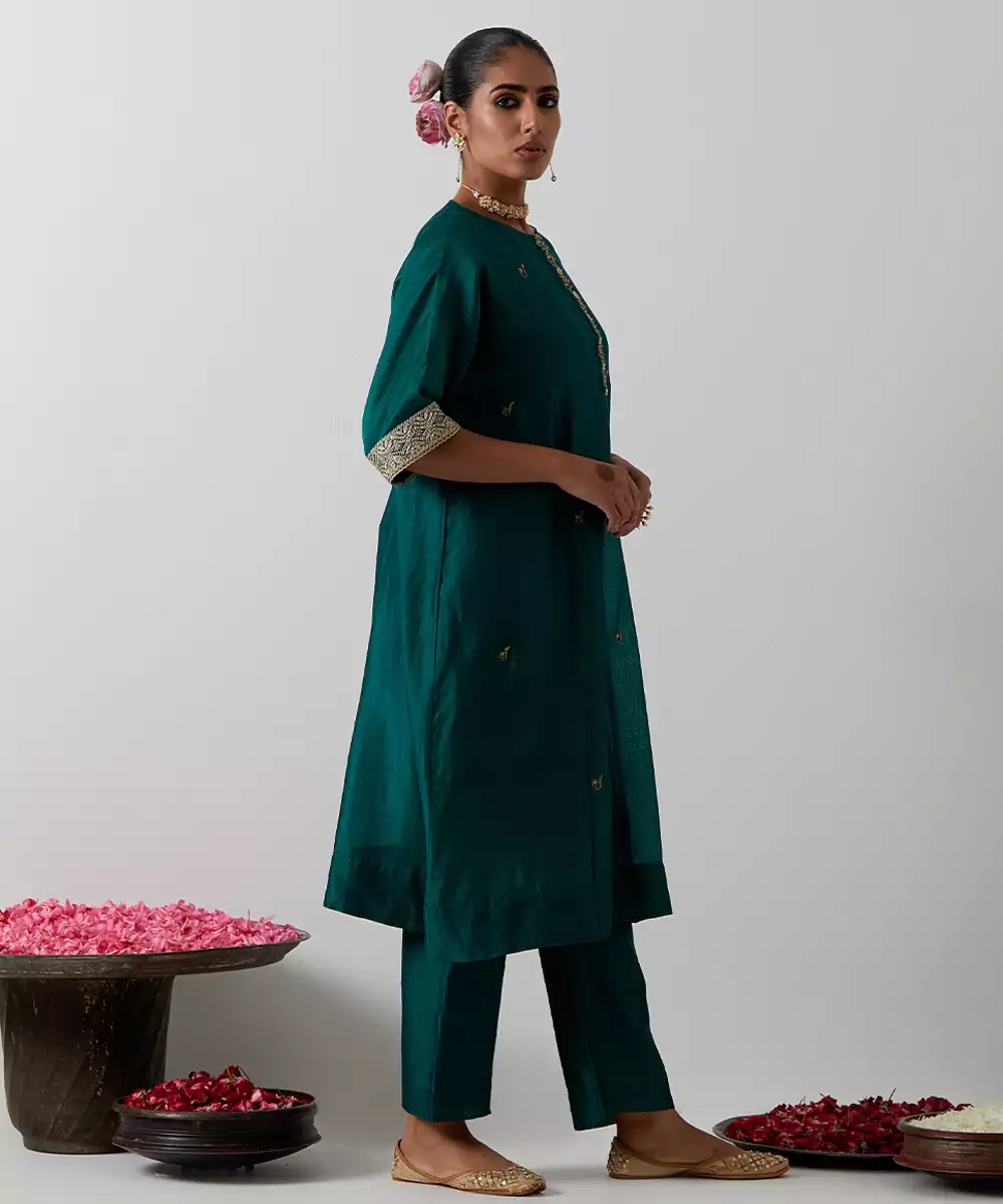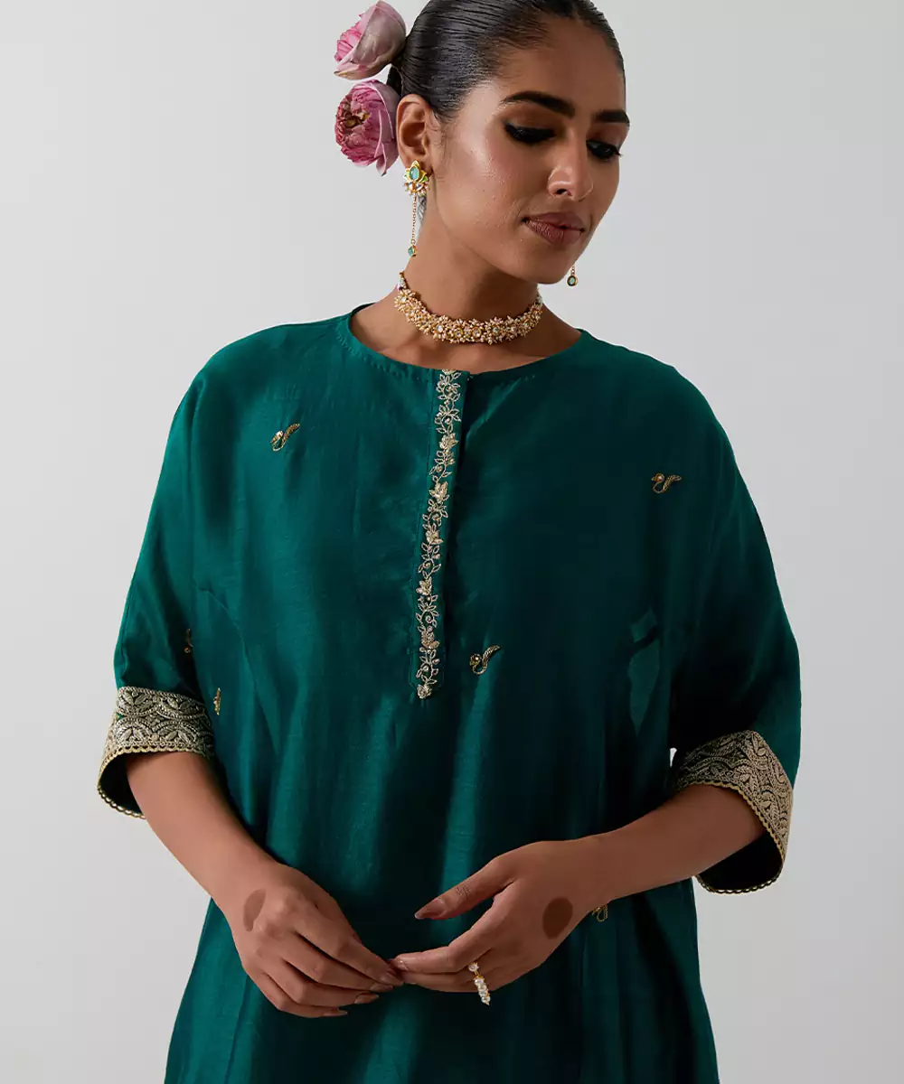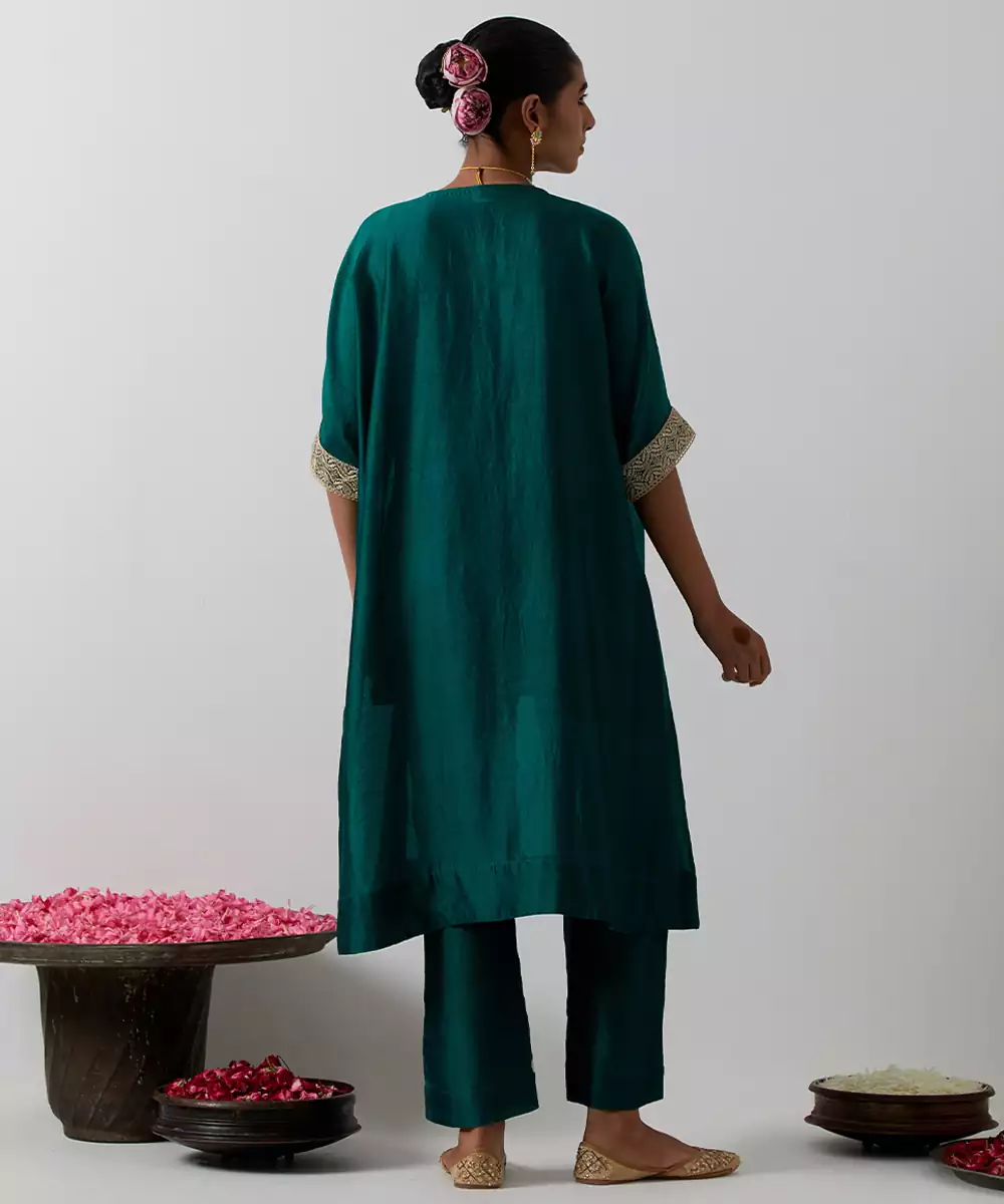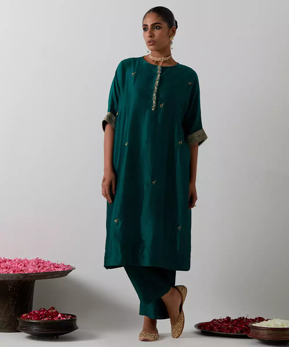This Green Embroidered Chanderi Kurta Set Blends Traditional Charm With Modern Elegance. Crafted From Luxurious Chanderi Fabric, It Features Intricate Embroidery That Adds A Refined Touch. The Lightweight Texture Ensures Comfort, While The Vibrant Hue Makes It Perfect For Festive Gatherings, Celebrations, And Special Occasions. A Graceful And Timeless Ethnic Ensemble.
