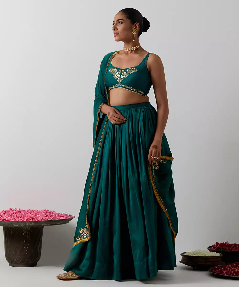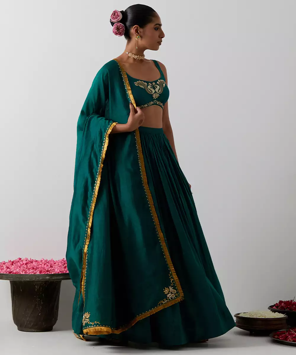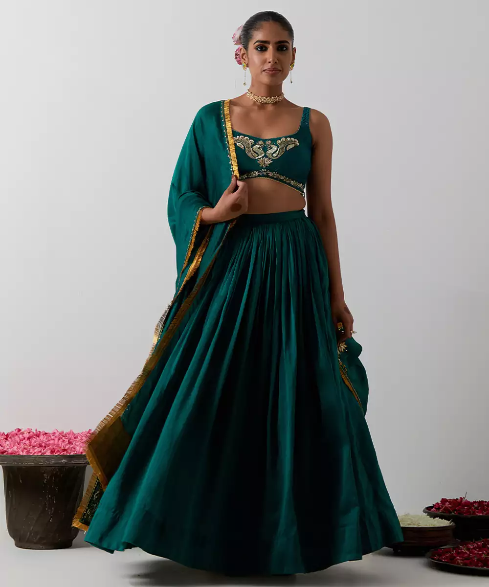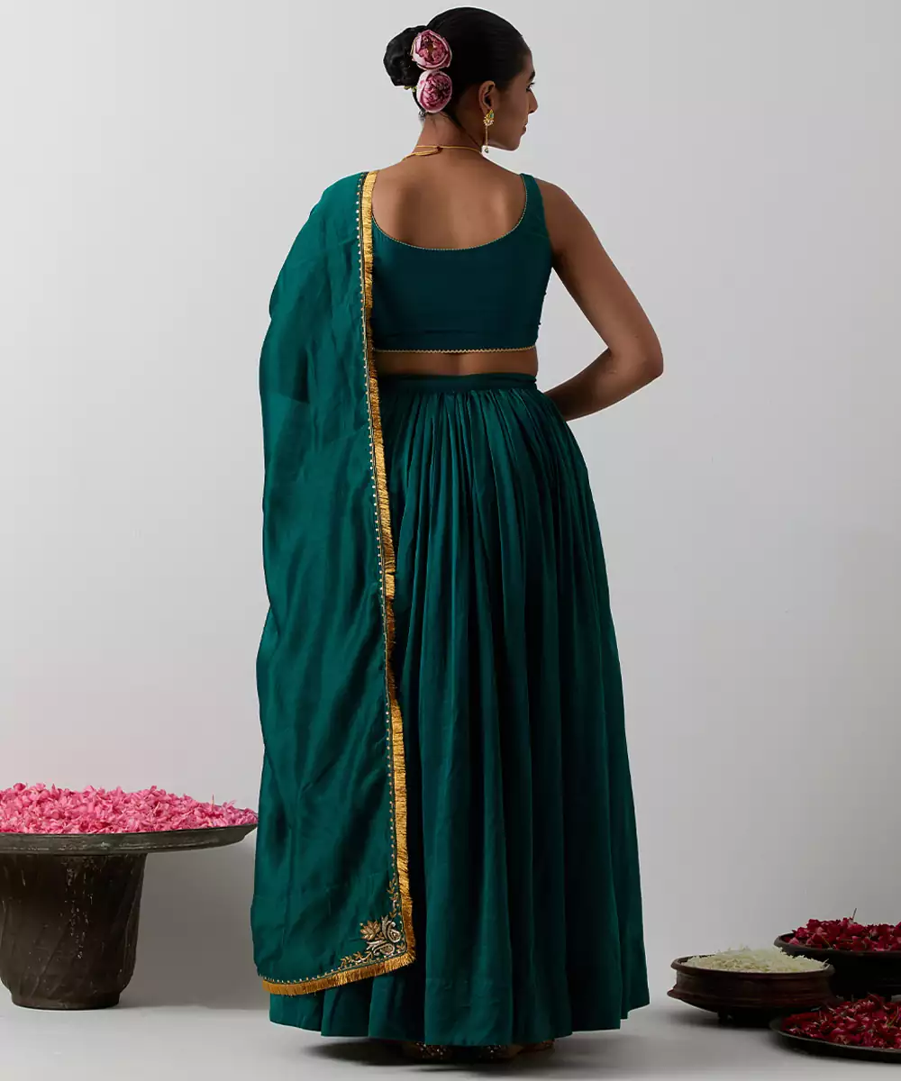 This Green Plain Chanderi Lehenga Set Brings Together Simplicity And Elegance In A Timeless Silhouette. Crafted From Soft, Lightweight Chanderi Fabric, It Offers A Graceful Flare And Subtle Sheen. Perfect For Festive Events, Weddings, Or Traditional Celebrations, This Ensemble Delivers Classic Charm With Comfortable, Understated Sophistication.
