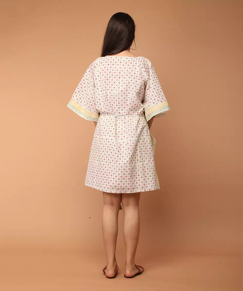 A Comfortable Cotton Kaftan In Hand Block Print. Boat Neck And Belt Tie Up At The Waist. Loose, Free Fall With Mint And Yellow Border Design On The Sides. This Short Length Kaftan Is Ideal To Style As A Dress Or Kurta With Pants For Summers.