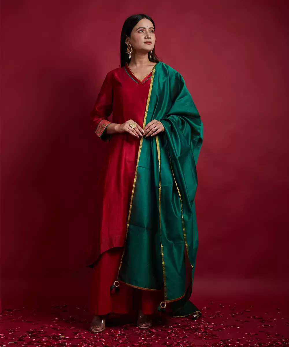 A Line Kalidar Kurta In Red Chanderi Handwoven Fabric. V Neckline With Detail Of Green And Gold Lace And Pipings. Broad Brocade Lace In Gold And Green At The Sleeves. This Kurta Comes With A Loose Cotton Palazzo In Red & A Deep Green Chanderi Dupatta With Border & Tassel Highlights. The Kurta Is Lined.