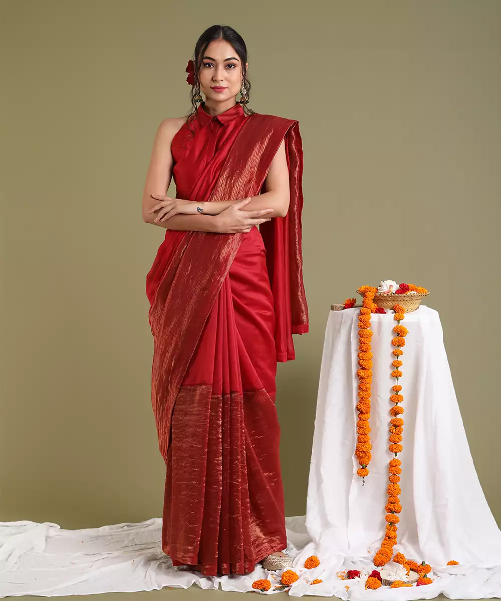 Red Halter Neck Blouse In Chanderi Handloom. Front Open Blouse Comes With Collars And Can Be Paired With Sarees Or Long Skirts In Complementary Colors, Can Be Styled With Denims As Crop Top.