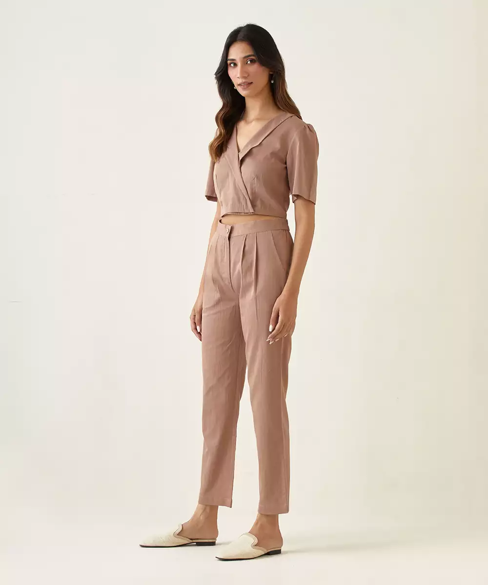 Taupe Crop Top With Shaped Shawl Collars And Side Button Closure Is Paired With Matching Front Open Pleated Pants. The Pants Come With Side Pockets And Back Elastic. The Monochrome Coordinate Set Made In Soft Cotton Glaze Is A Young & Trendy Outfit To Wear In The Office.