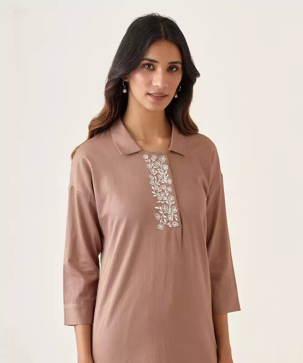 Taupe Kurta With Peter Pan Inspired Collars And An Embroidered Front Placket In Contrast Off White. Kurta Made With Cotton Glaze Comes With Cuff Sleeves, A Box Pleat At The Back And Is Paired With Matching Straight Pants. A Comfortable, Fuss Free Outfit For Those Who Prefer Fusion Wear.