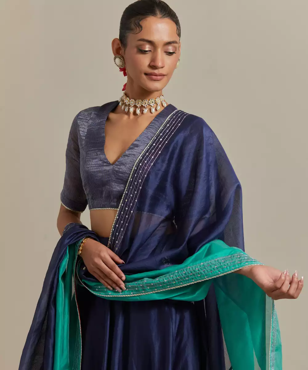 The Blue Chanderi Skirt With Intricate Zardozi Embroidery Colour: Blue Fabric: Chanderi Components : 1 Blouse / 1 Skirt / 1 Dupatta