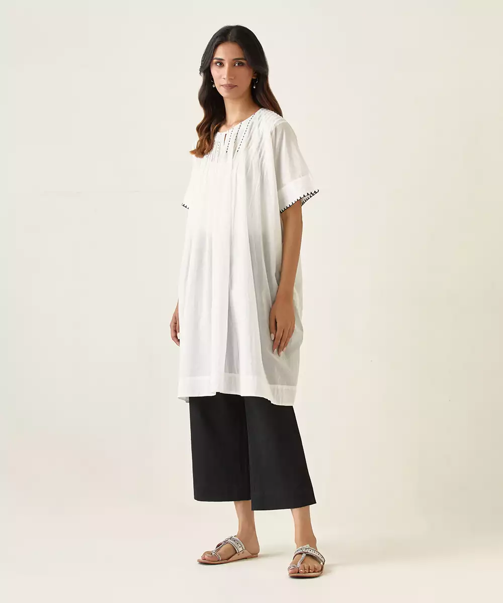 Featured Here Is A White Cotton Kaftan, With Pin Tucks Running From Front To Back, Highlighted With Contrast Kantha Stitches And Blanket Stitches On The Sleeves. Kaftan Has A Keyhole Button Closure And Comes With Black Cotton Glaze Pants. A Serene Summer Outfit For A Full Day In The Office.