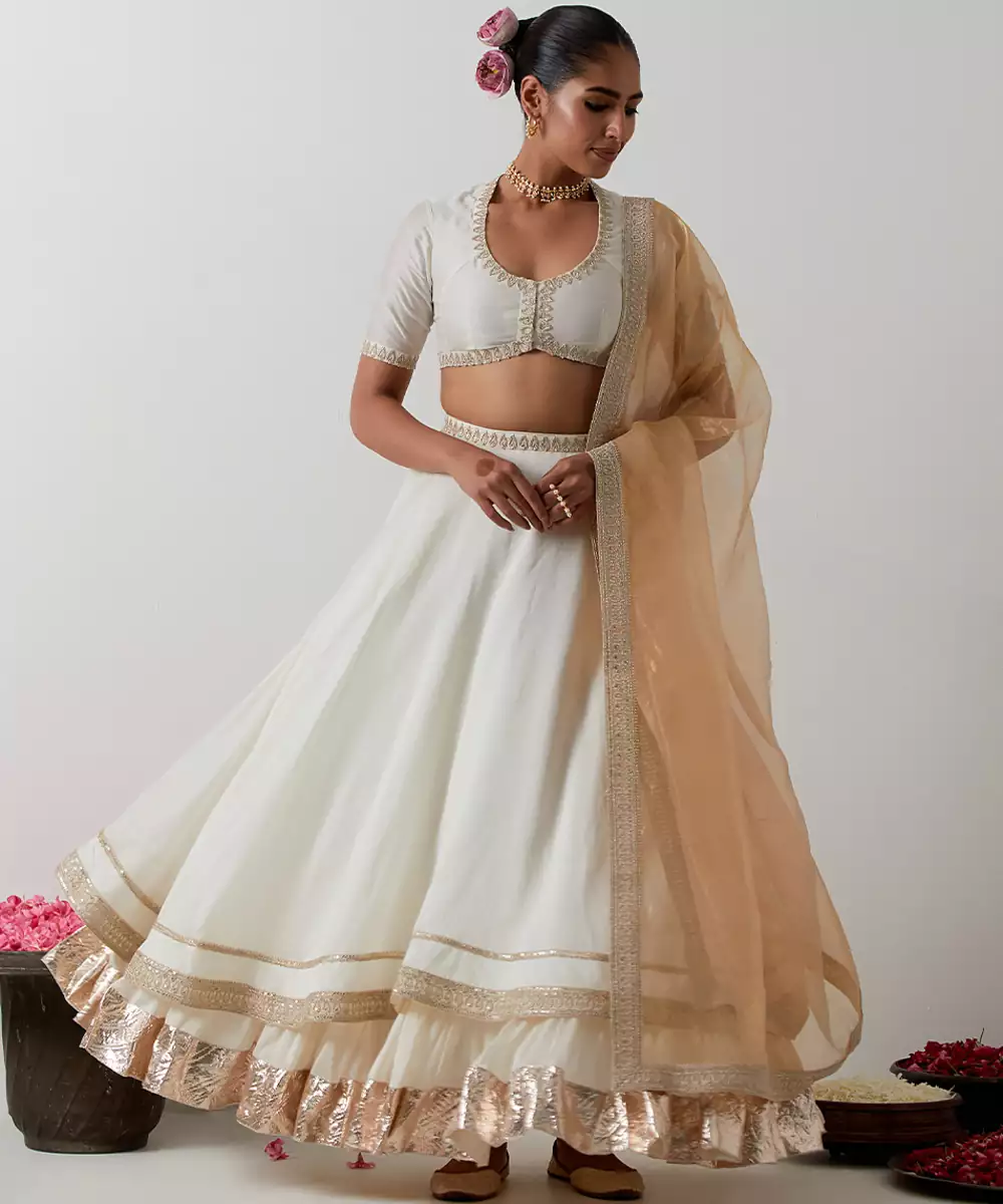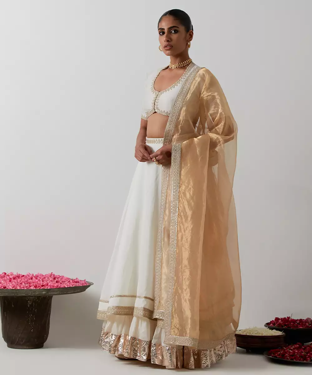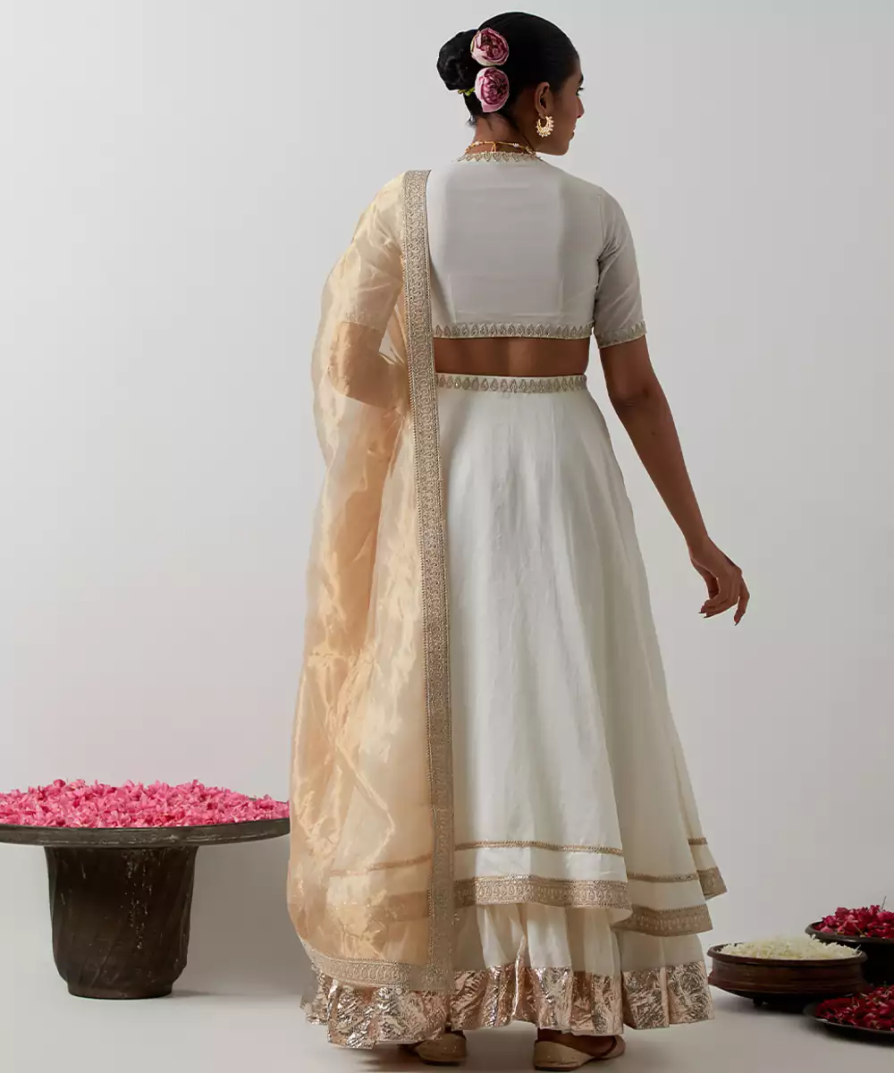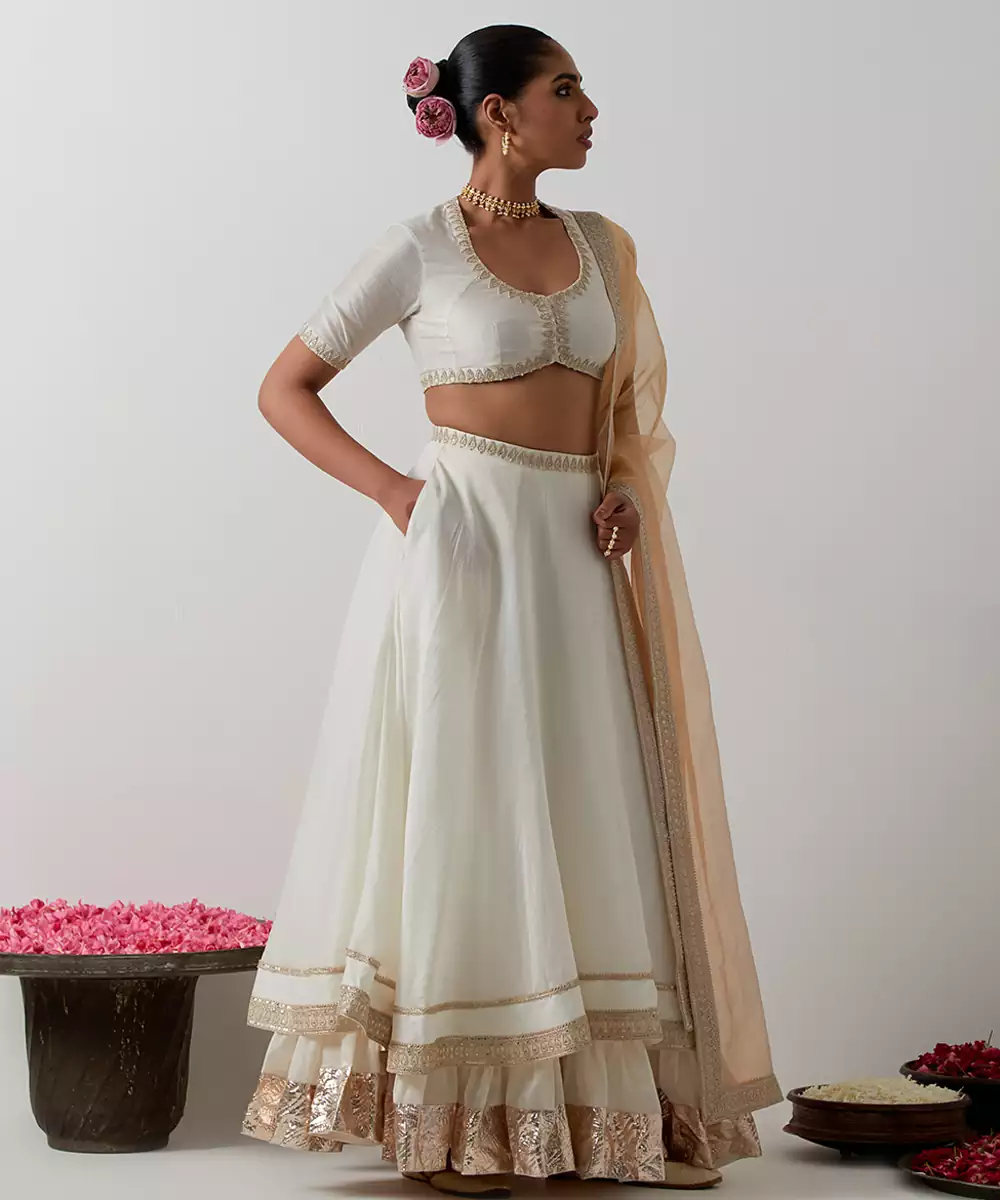 This White Plain Chanderi Lehenga Set Brings Together Simplicity And Elegance In A Timeless Silhouette. Crafted From Soft, Lightweight Chanderi Fabric, It Offers A Graceful Flare And Subtle Sheen. Perfect For Festive Events, Weddings, Or Traditional Celebrations, This Ensemble Delivers Classic Charm With Comfortable, Understated Sophistication.